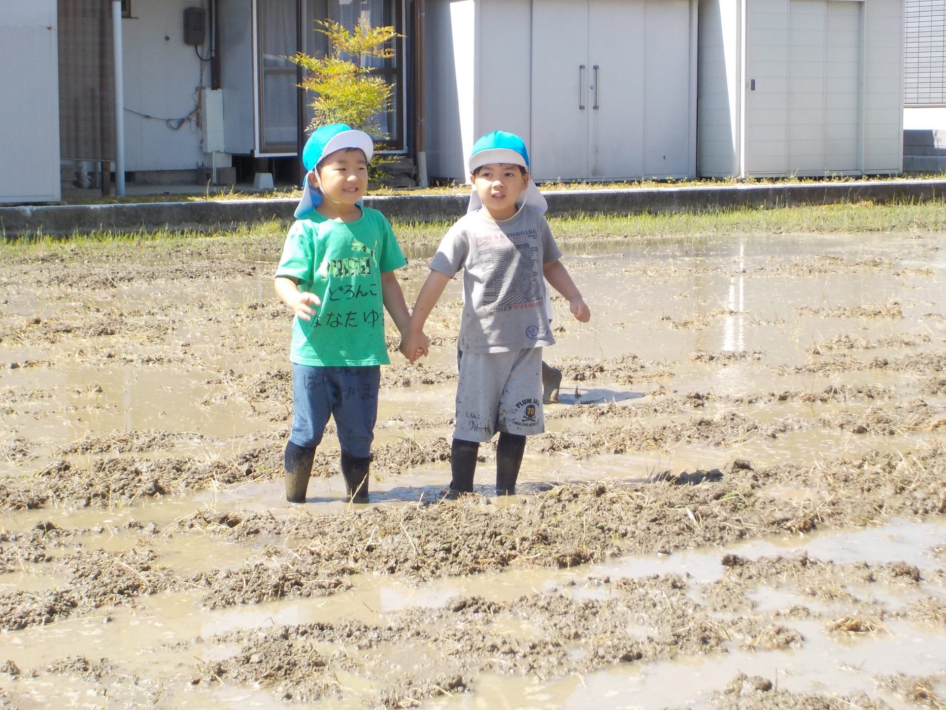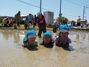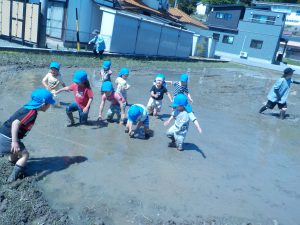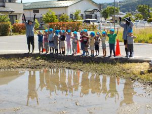 今後、年長児が田植えの経験も行います。地域の関島さんが「なかなか手で植える体験が出来る機会は少なくなっている。昔ながらの稲作を若い世代の皆さんにもぜひ体験してほしい。」と言われていました。関島さんの想いを家庭へも伝え、ぜひ親子で田植えの体験ができるようにしていきたい。