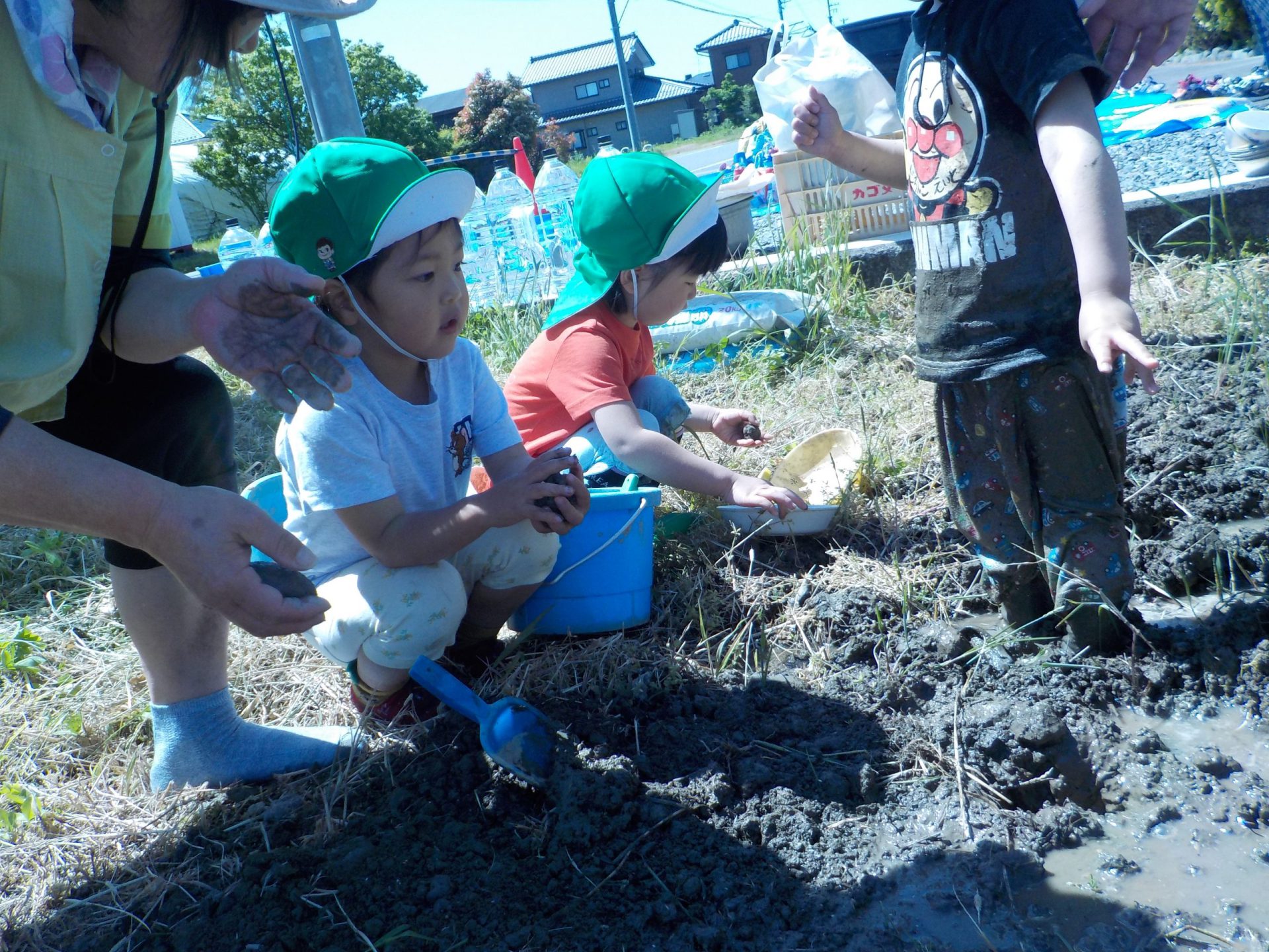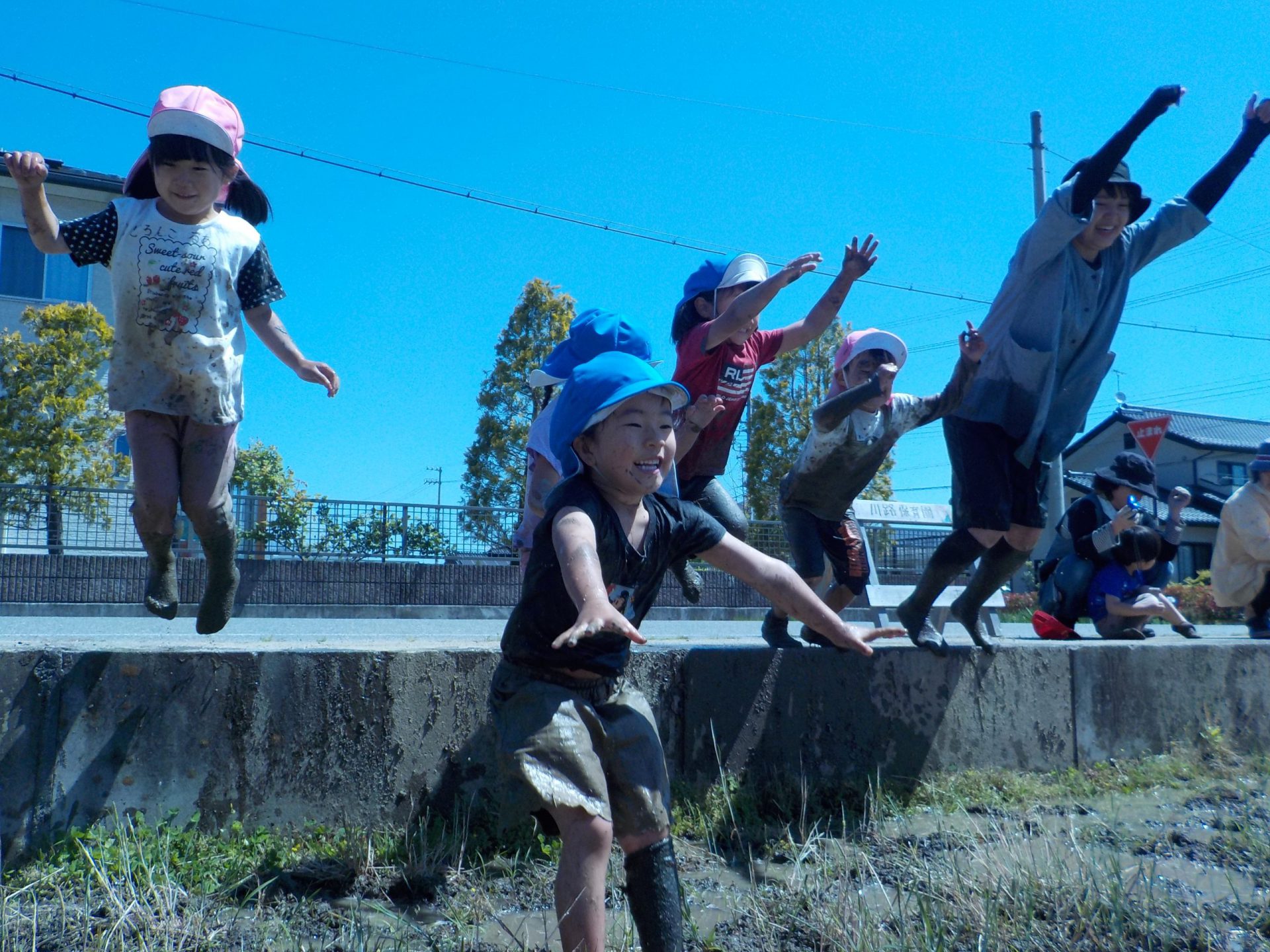 地域の方のご厚意により、園内だけではできない田んぼでの泥んこ遊びを体験することができました。 こどもたちは田んぼの泥の柔らかさ、匂いなどを味わい、園庭の泥との違いを感じることができたと思います。遊び場としての提供だけでなく、汚れた後の体や着ているものの始末まで考えてくださり、本当にありがたいです。