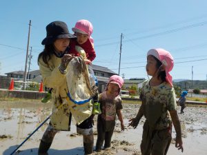 田んぼでは地域の方やJAの方、延長保育の職員の皆さんがお手伝いに来てくださっていました。