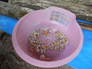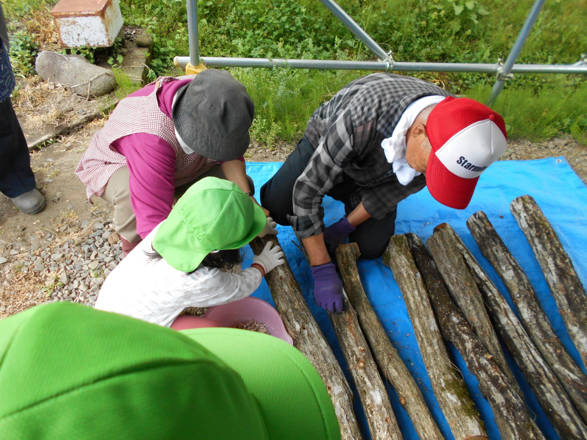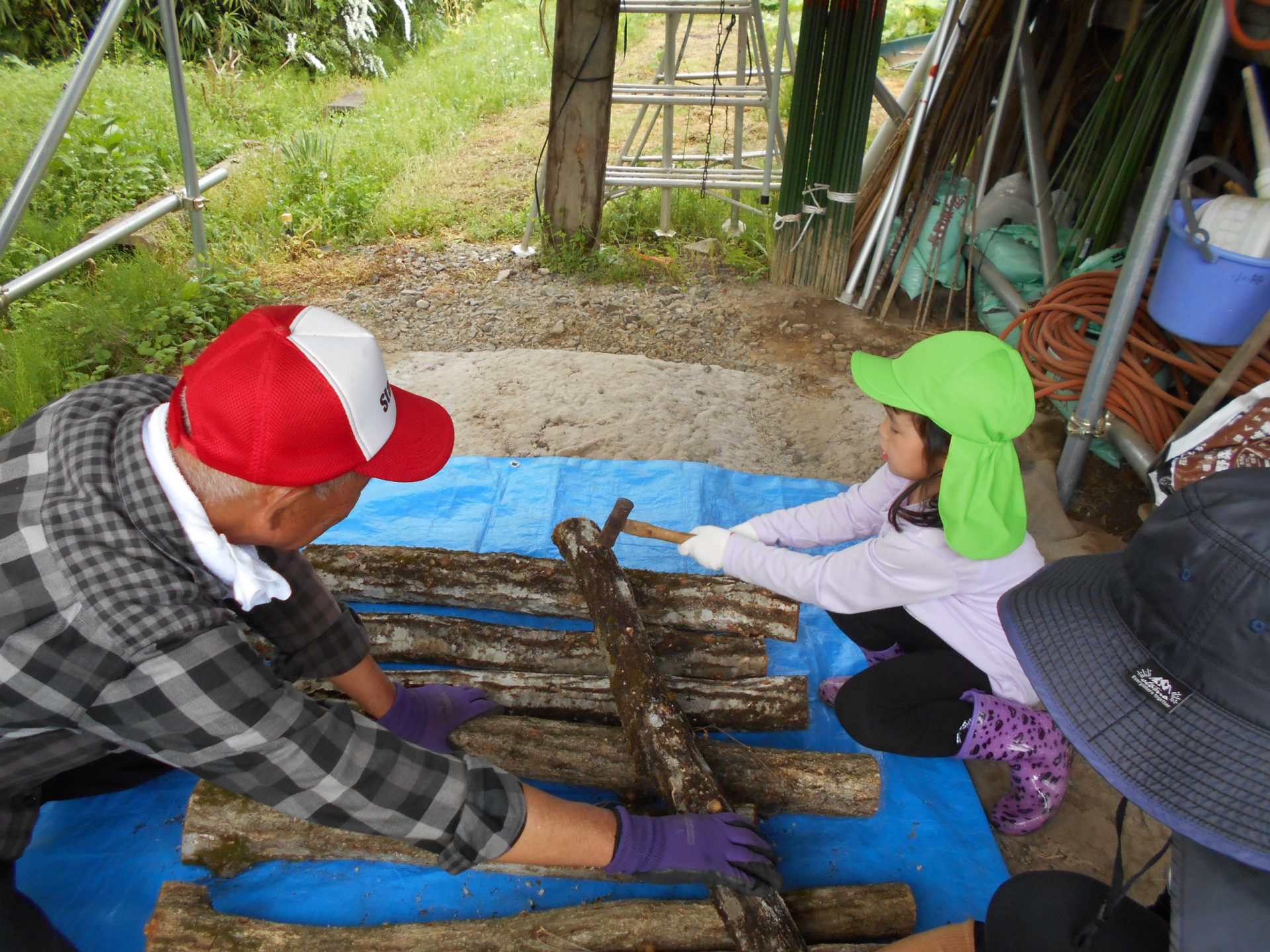 しいたけ栽培のお手伝いでは、金槌を使う体験もできました。それぞれに力加減をしながら、小さな的をめがけて打ち付ける…なかなか難しかったですが頑張ってできました。