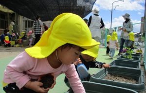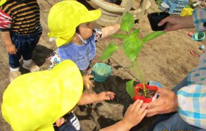 ・野菜の苗植えを見たり、一緒にやってみようとする意欲も見られました。