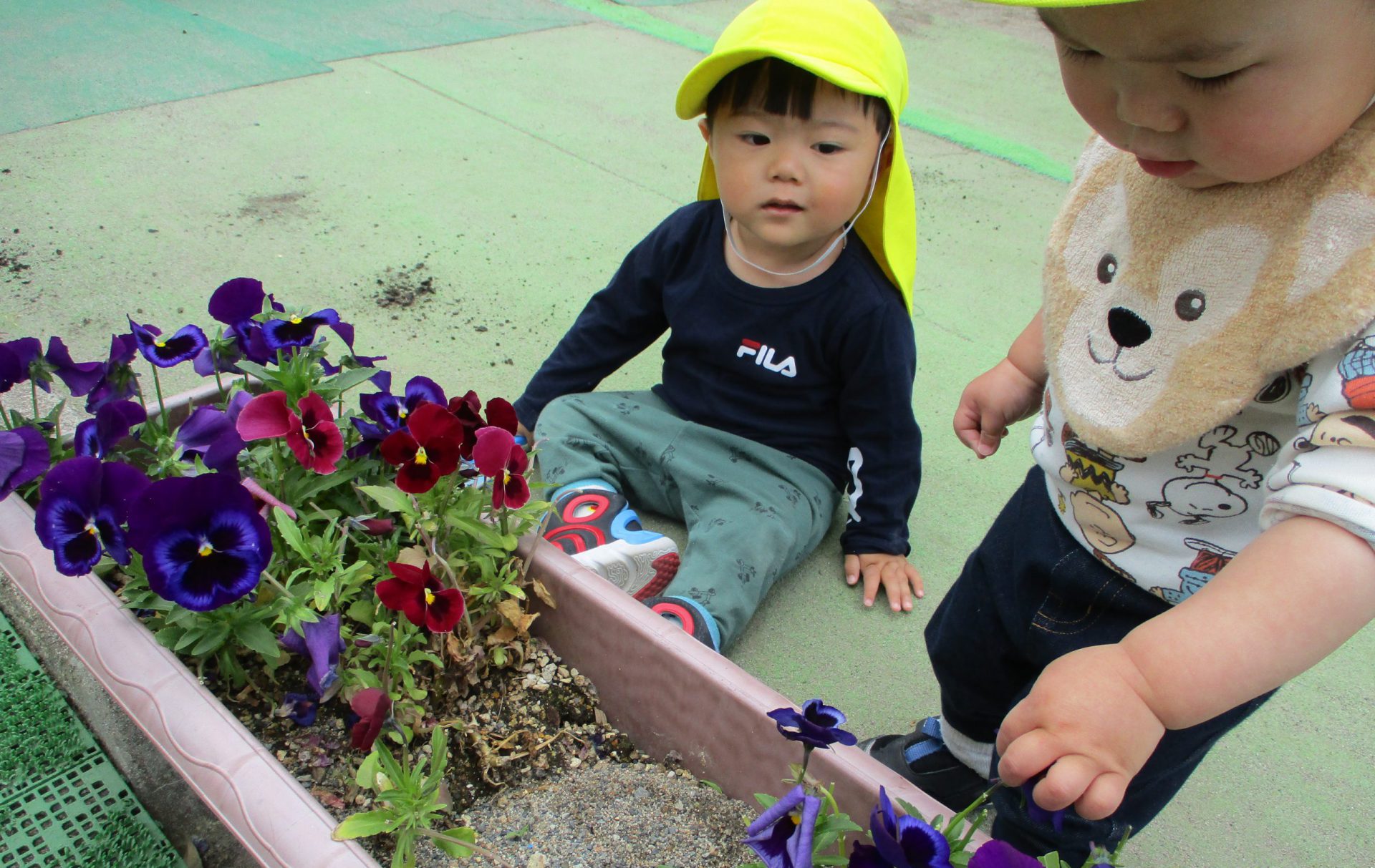 季節ならではの花々が植えられている、園庭のプランター。草花を見たり触れたりして、楽しんでいます。