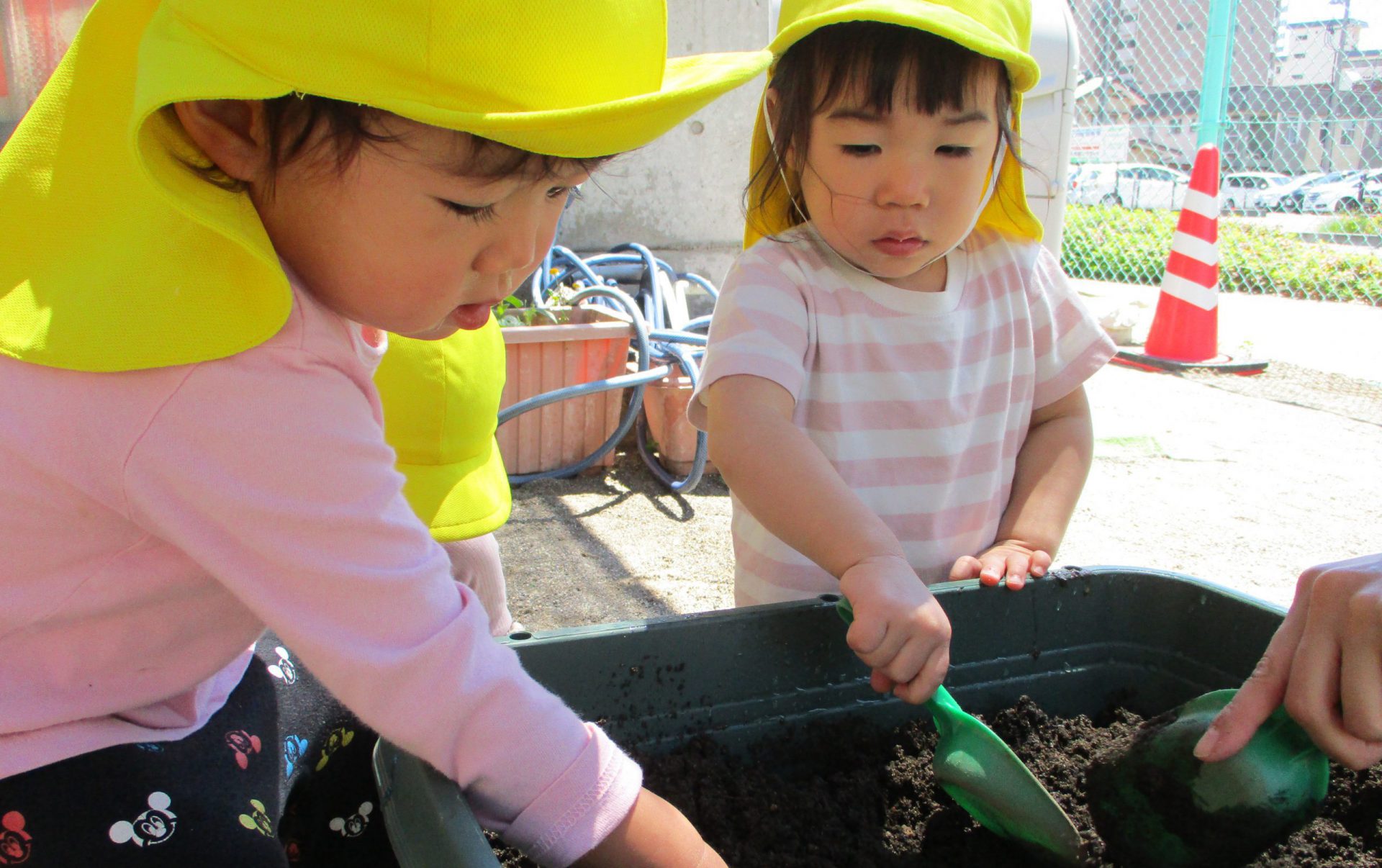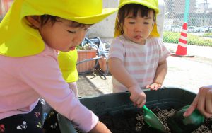 シャベルを持ち、一緒に土を耕そうとしています。「よいしょ、よいしょ」と、保育士の姿を真似ています。意欲的ですね。