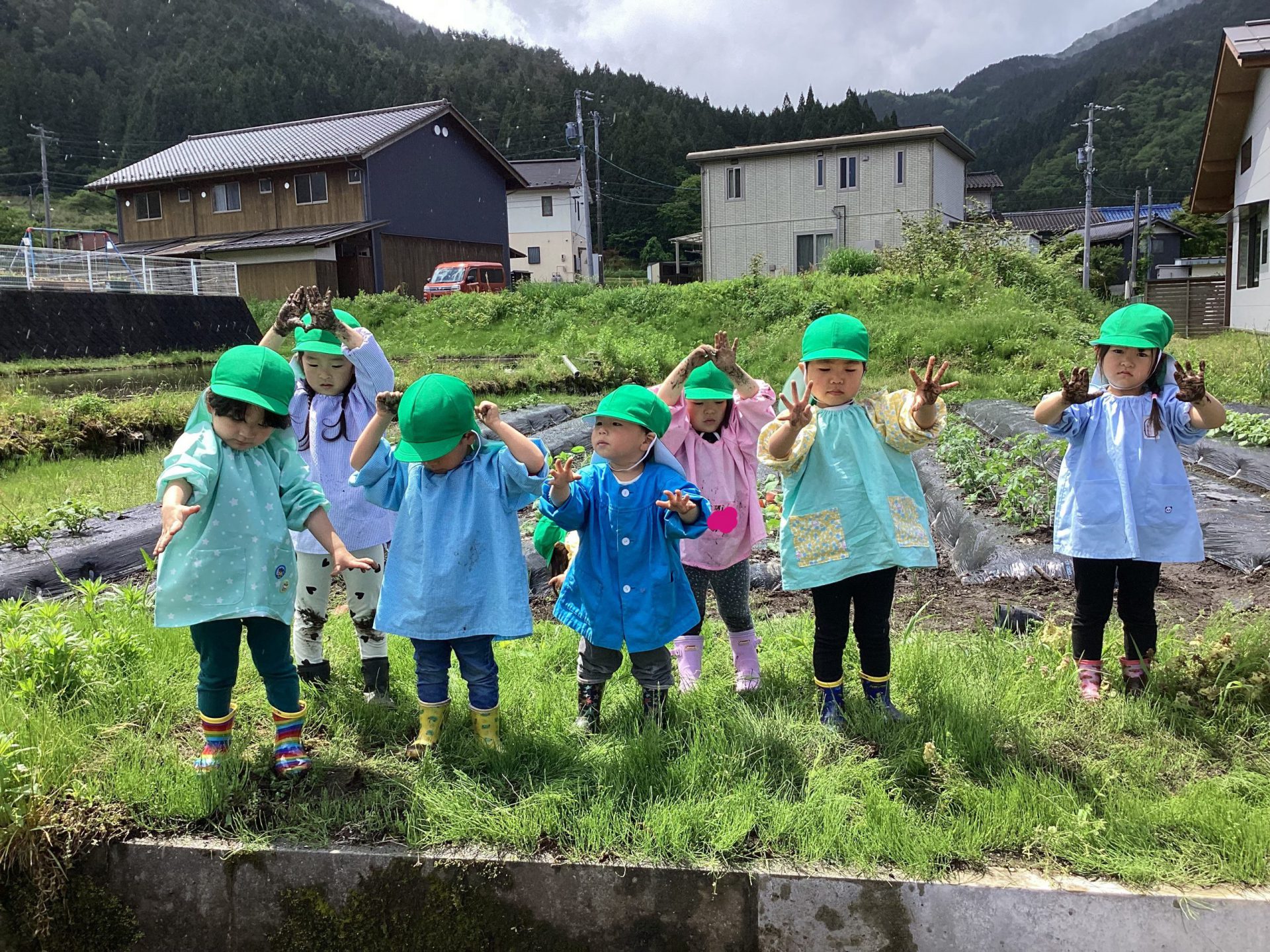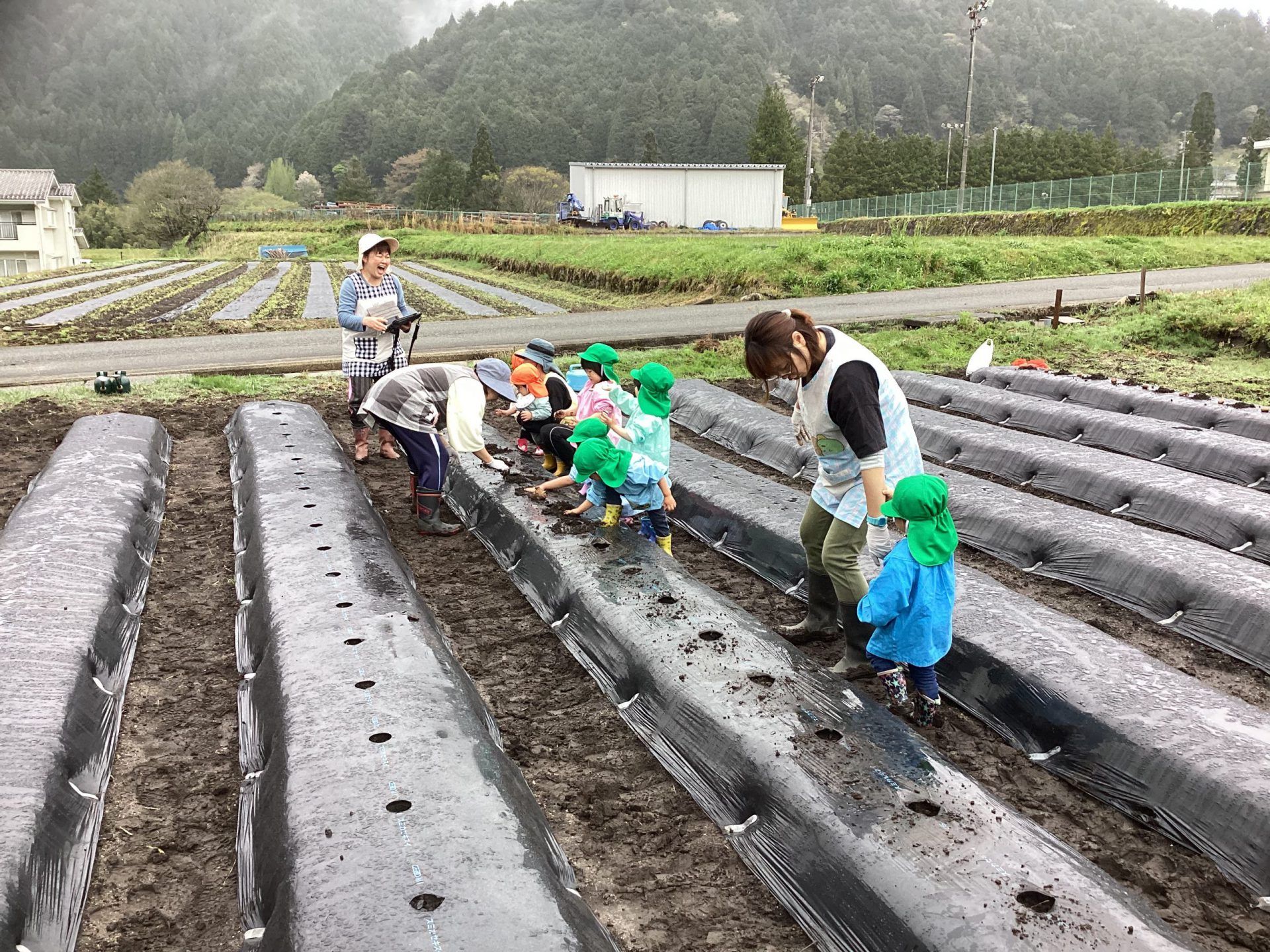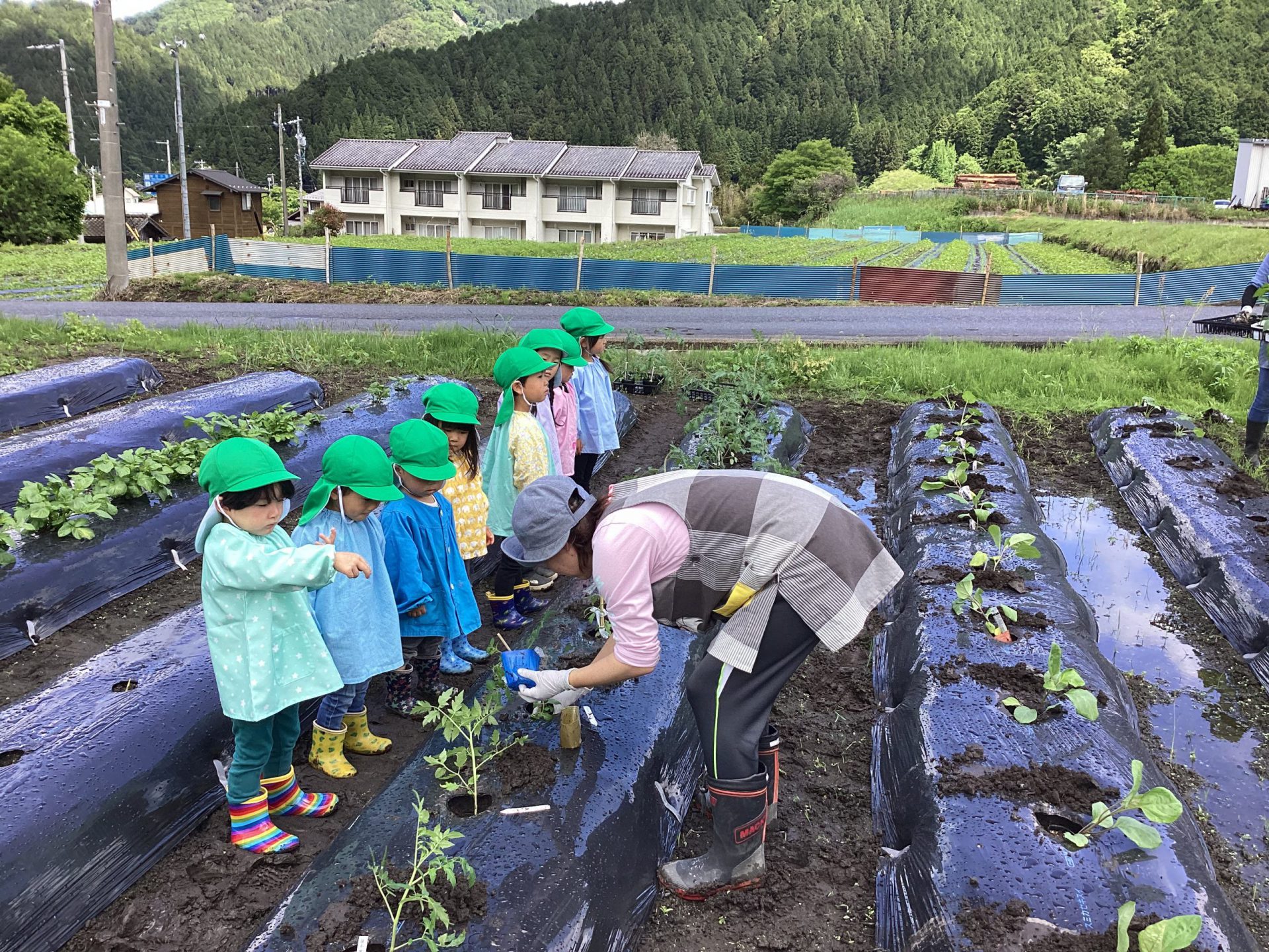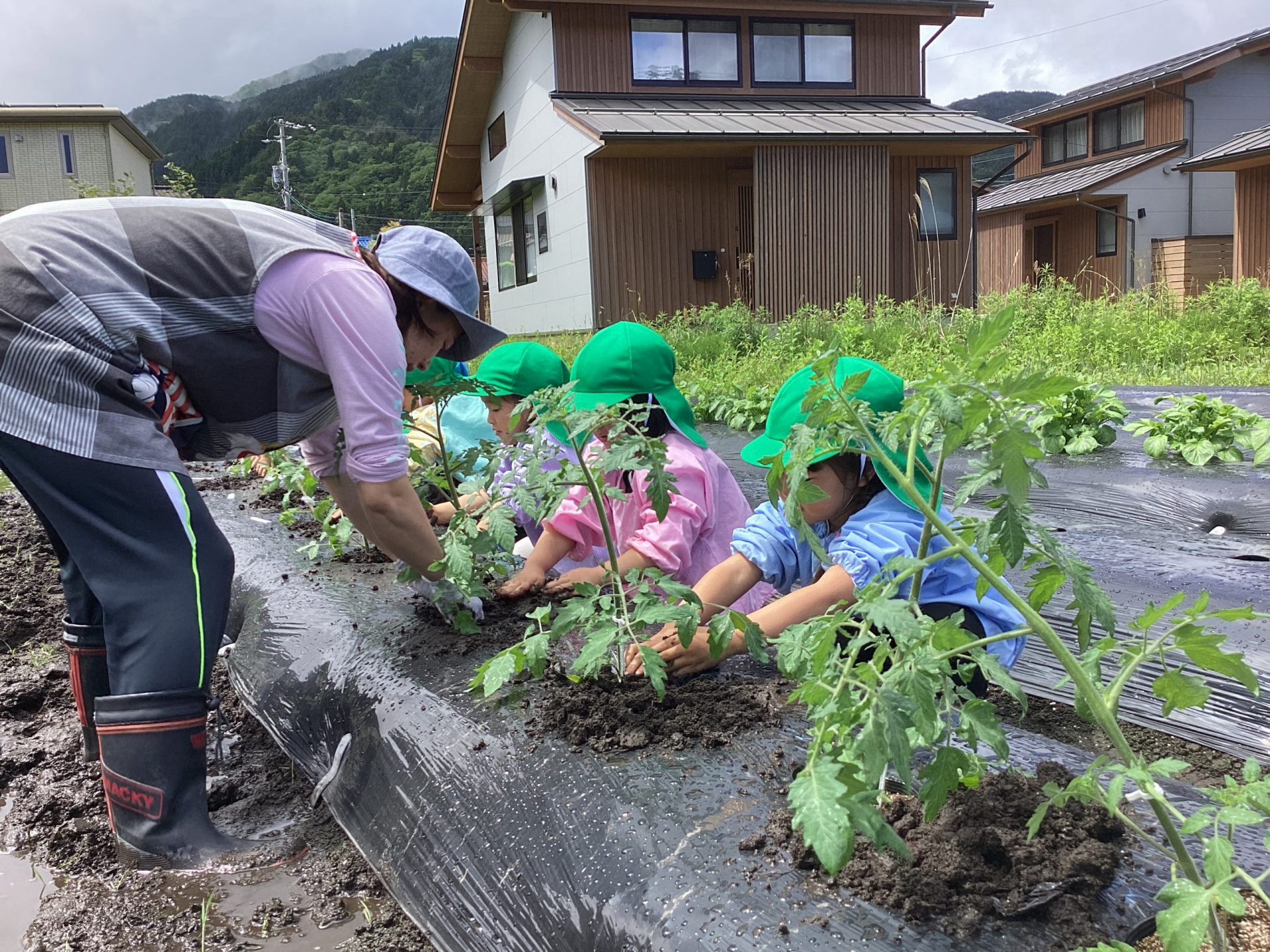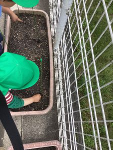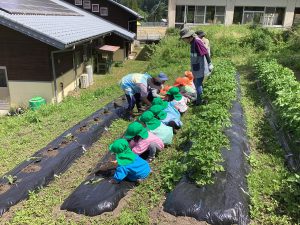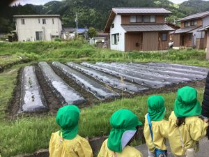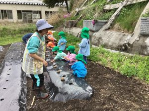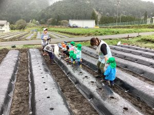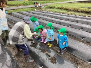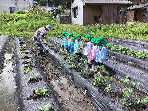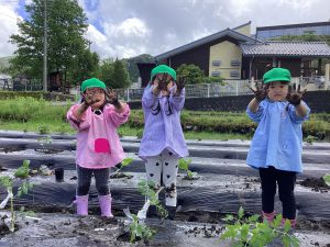 5月16日、雨上がりで足場の悪い中でしたが、野菜の苗を植えました。3回目となると、土に抵抗があった年少組の子ども達も進んで苗植えを行いました。