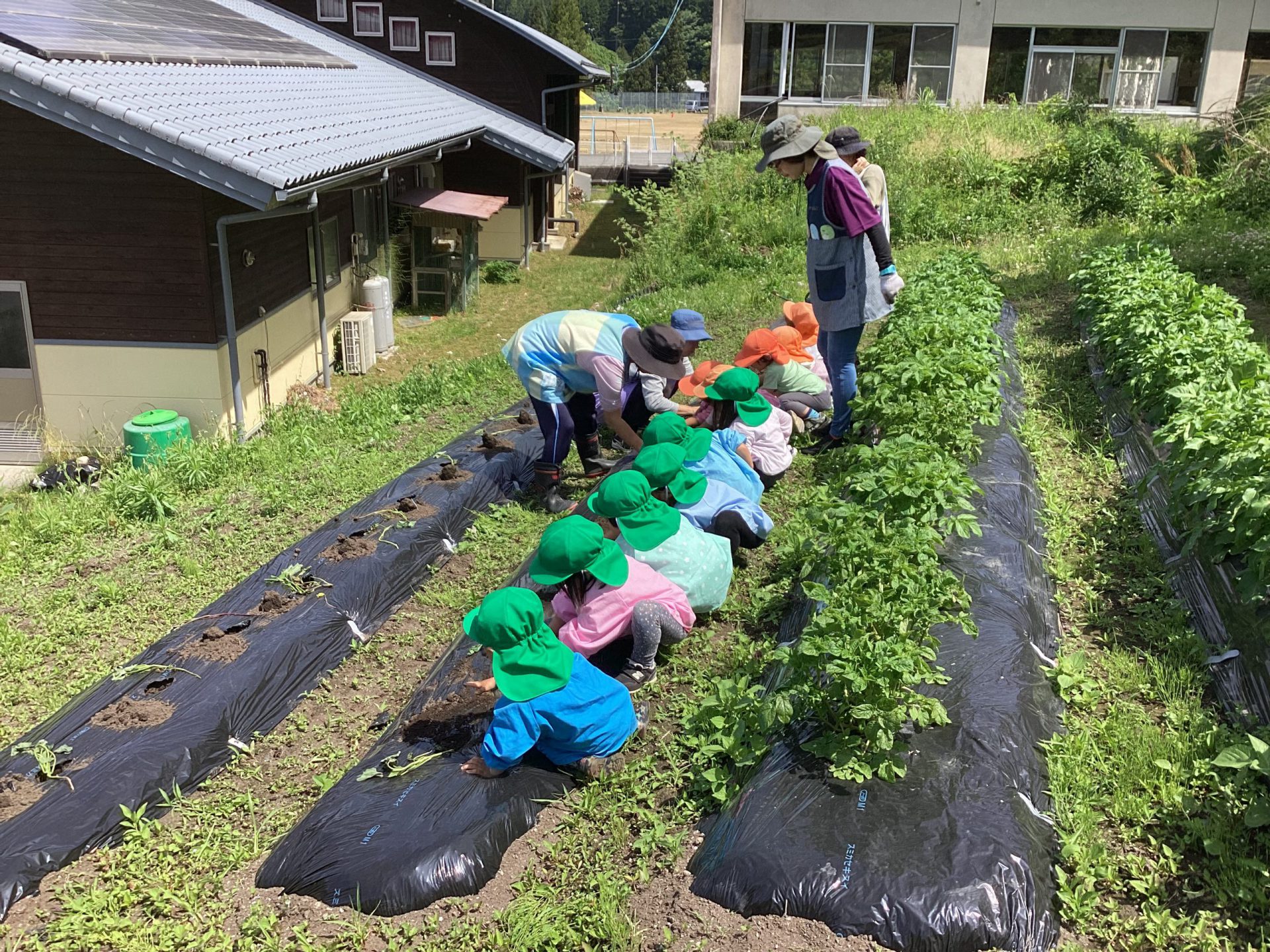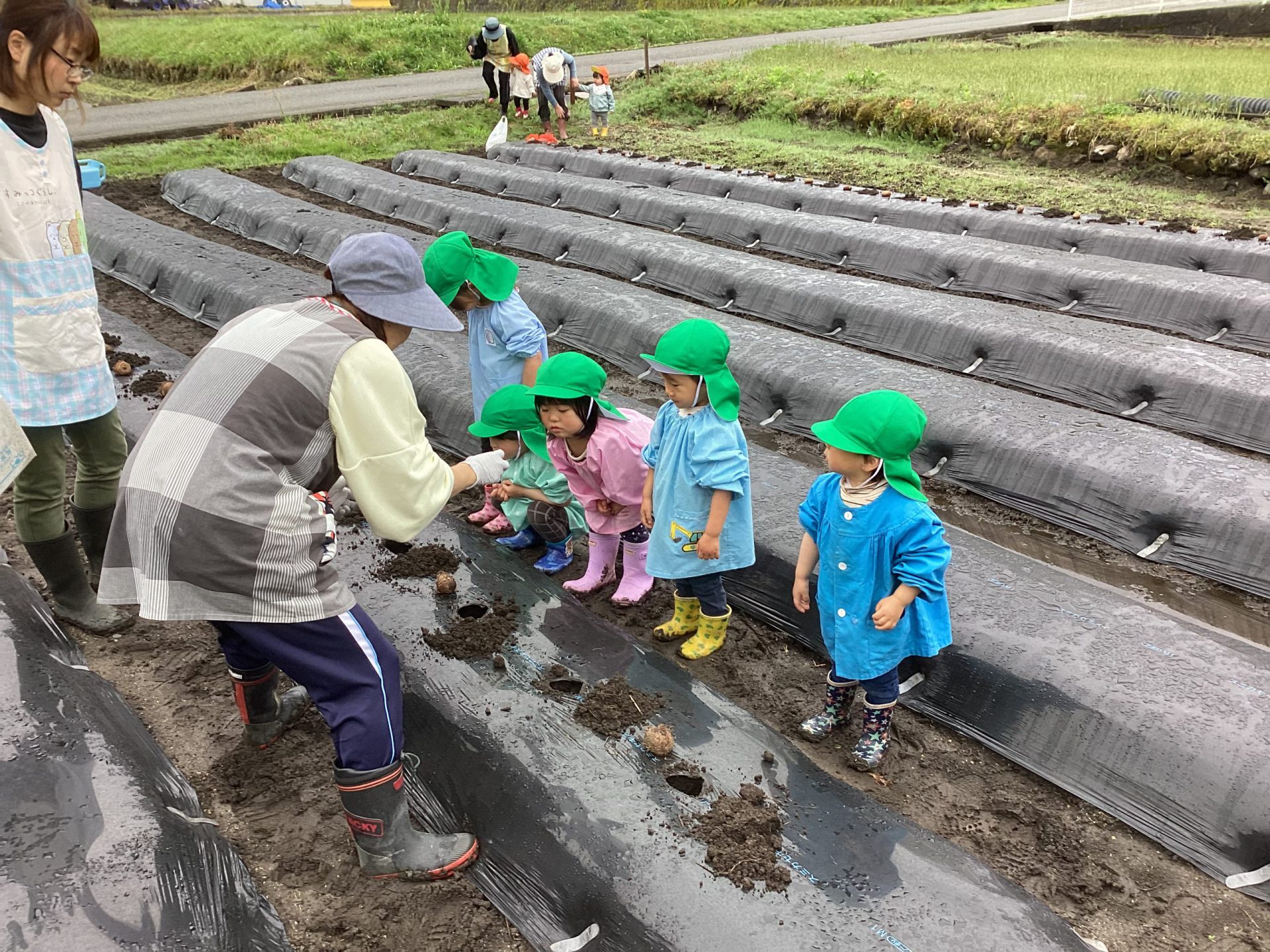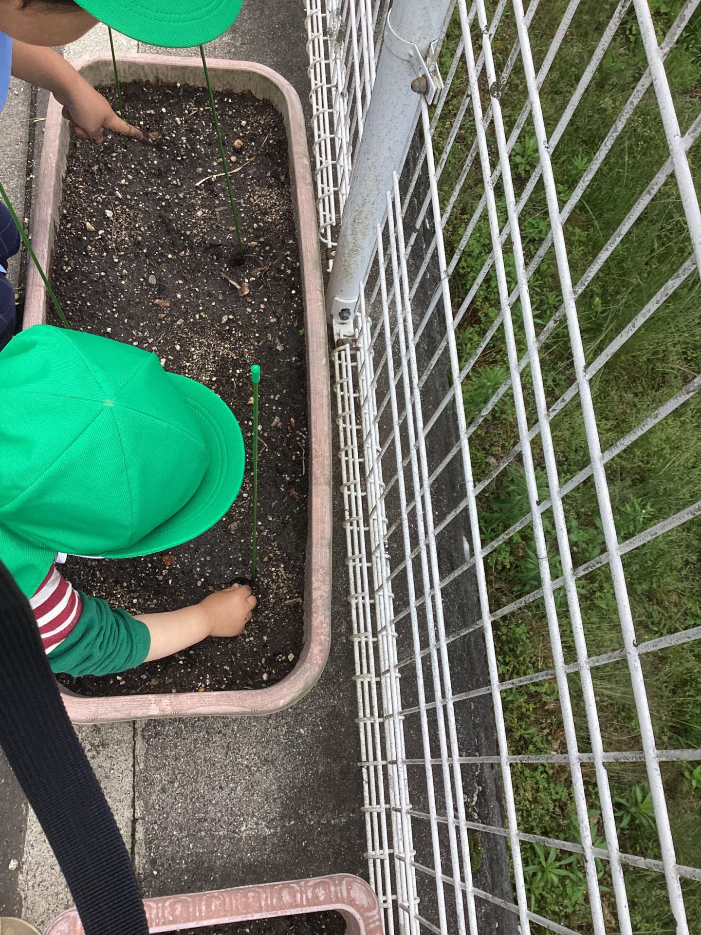 上の畑は、2歳児のお友達と一緒に、ジャガイモを植えました。