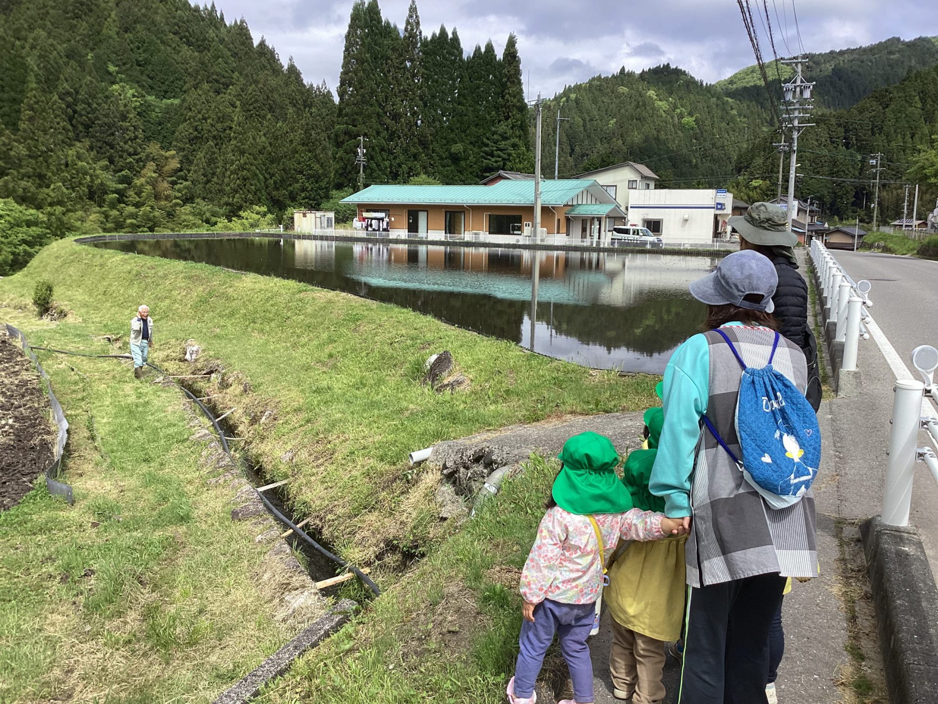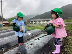 下の畑は、1歳児のお友達が見守る中、里芋と、ジャガイモ(赤)を植えました。植えた後は、年中組が水やりを行いました。