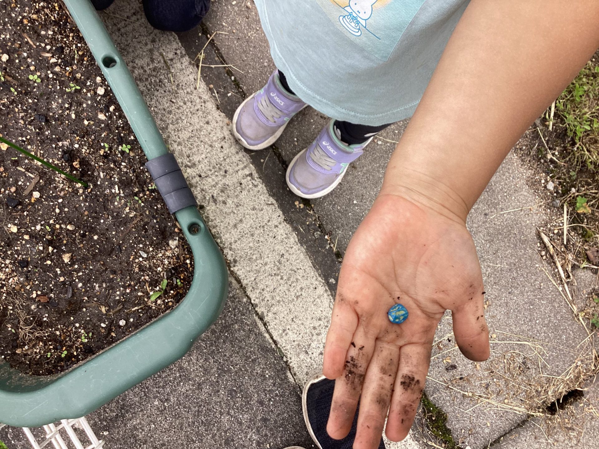 お散歩途中に、畑を作ってくれたおじさんに「ありがとうございました」と、挨拶をしました。散歩に出かける時は、野菜の生長を確認します。