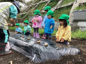 今年は、園舎裏(上の畑)と園舎下(下の畑)の畑をお借りすることができ、子ども達と畑の話し合いを行いました。じゃがいも・さつまいも・ピーマン(2種類)・トマト(3種類)・きゅうり・なす(3種類)・かぼちゃを植える事に決まりました。秋にも、大根や玉ねぎを植える予定です。