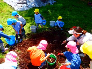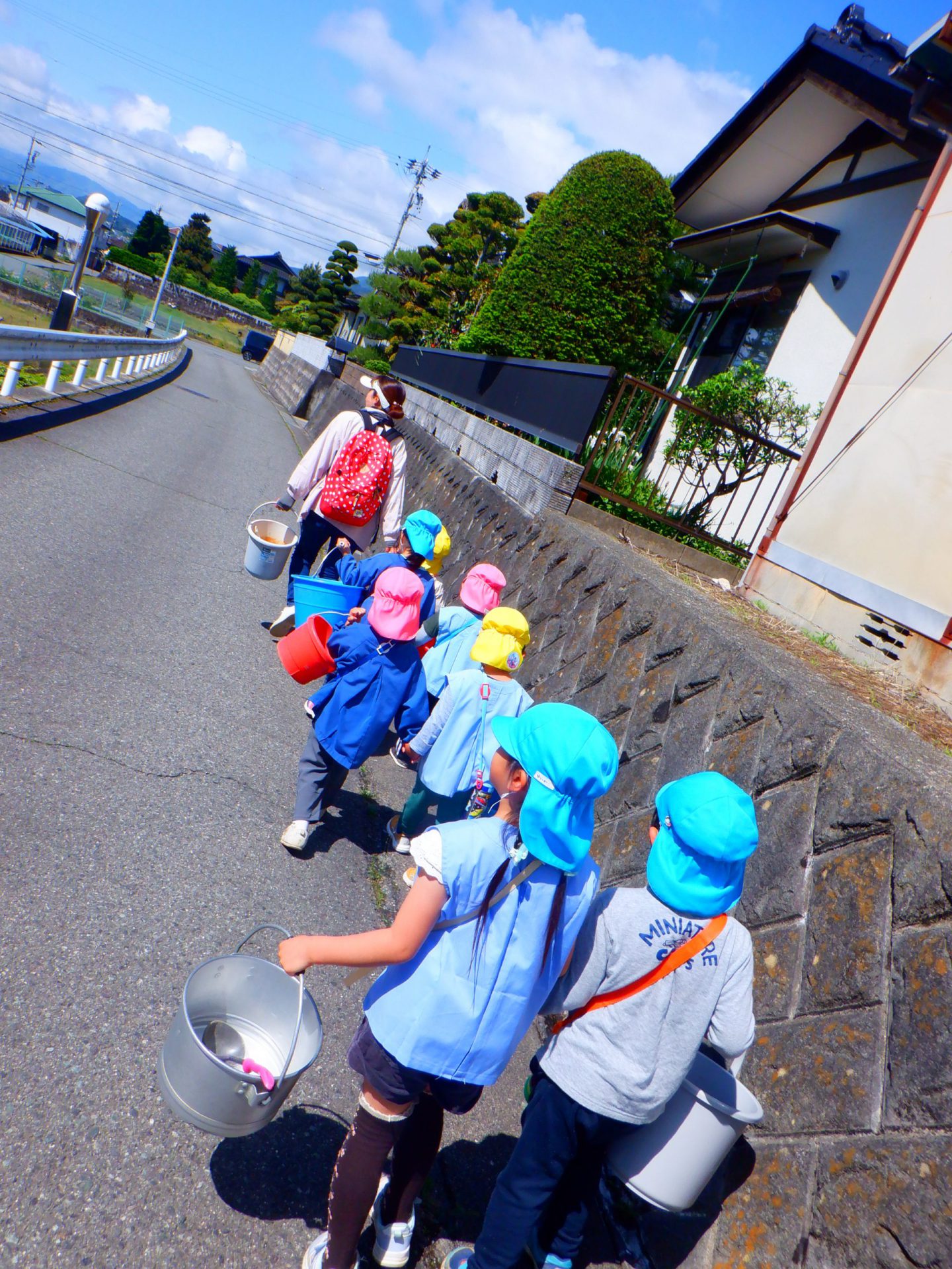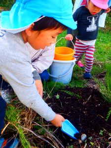 園児のK君のおうちで「畑の隅でカブトムシの幼虫がいっぱい生まれているので、捕りに来てくださいね。」と誘っていただいたので、皆でバケツを持ってでかけていきました。