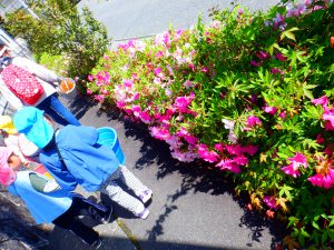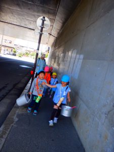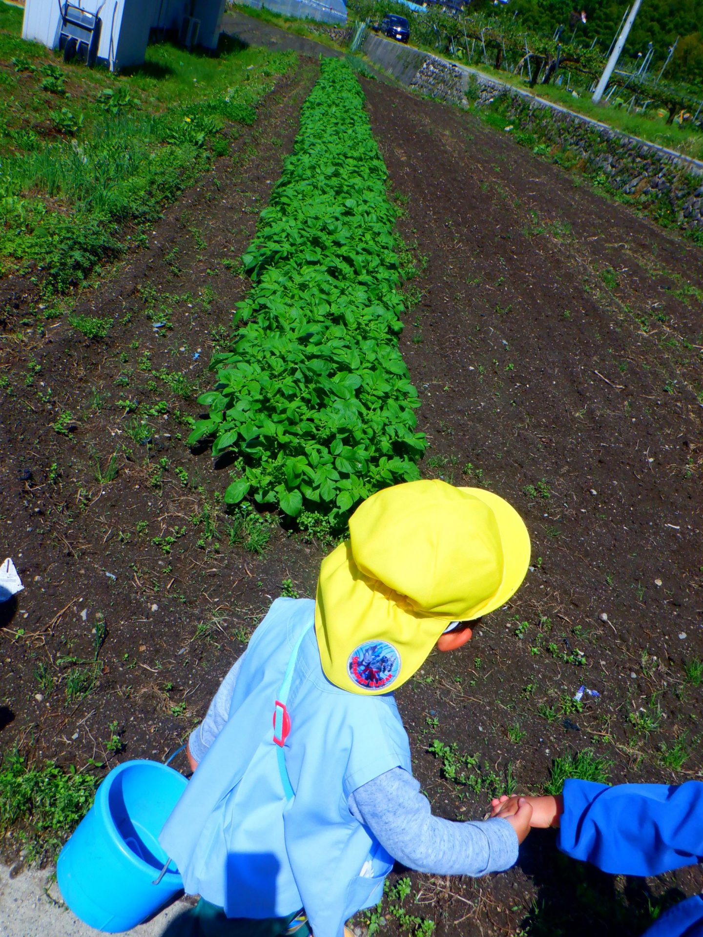 「側溝に蜘蛛の巣がある。」 「畑のジャガイモが大きくなっている。」歩きながらこどもたちはいろいろなことを発見していきます。