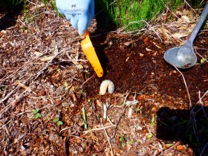 おうちの後ろの畑に行って土の上に撒かれているチップよけてみると・・・