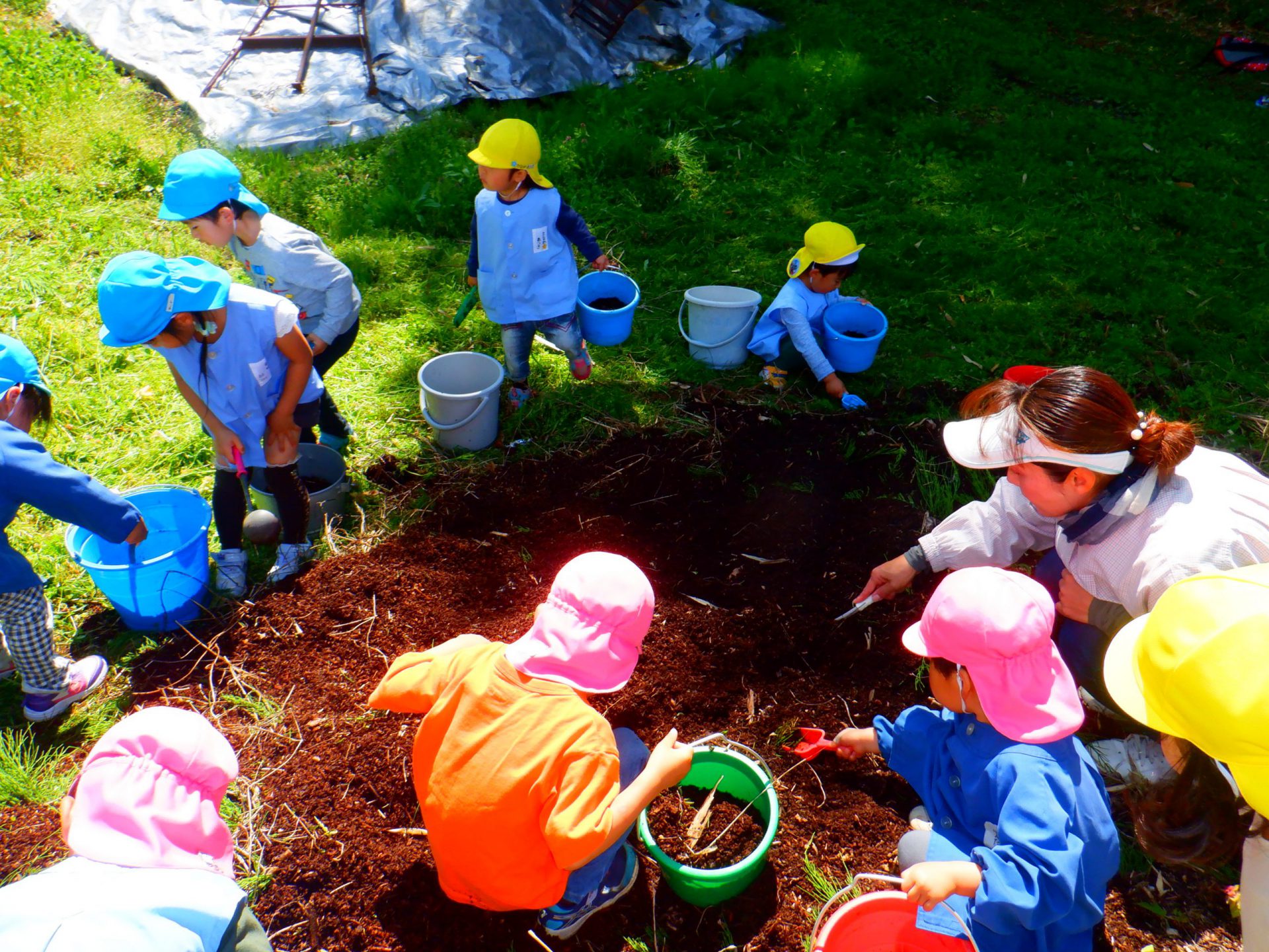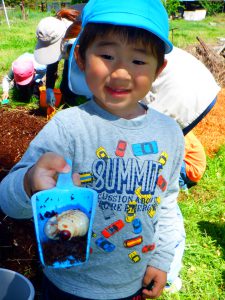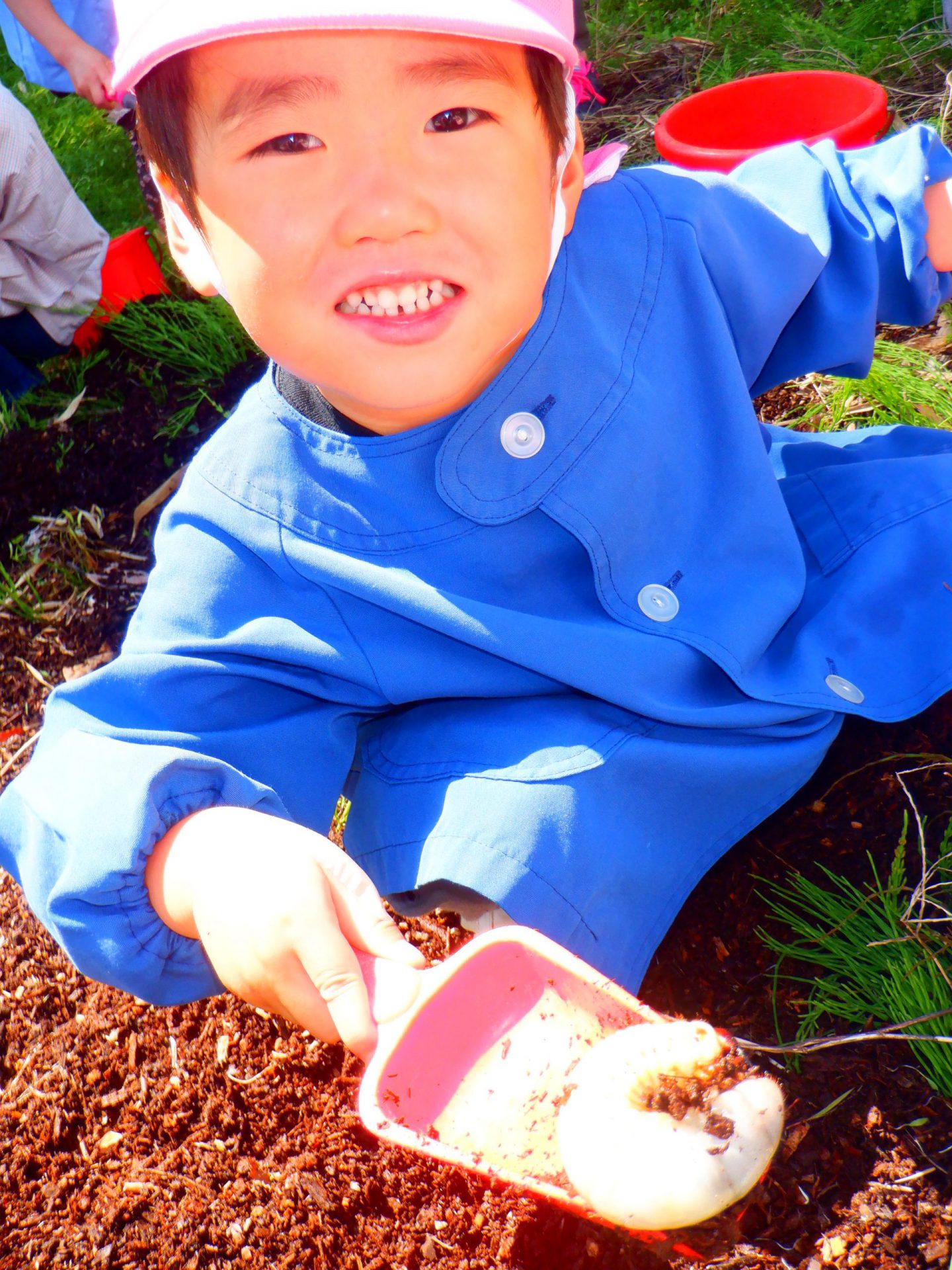 ・昨年もカブトムシの幼虫を園で飼って、成虫になって土の中から出てくる様子を見ることができ、年長、年中のこどもたちは興味があり、成虫になることを期待しながら捕ることができていた。全部の幼虫が成虫になれることはなく、途中で死んでしまったり、奇形になってしまったりしたこともあり、成虫になるまでの飼育の仕方をこどもたちと一緒に学び、大事にしたい。家庭へ持ち帰ったおともだちもいたので、飼育の仕方を家庭にも伝え一緒に成虫になる様子が見られるようにしていきたい。