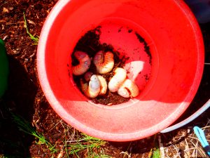 畑を掘り始めると次々とカブトムシの幼虫がでてきます。