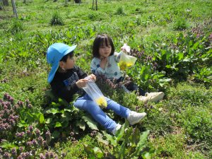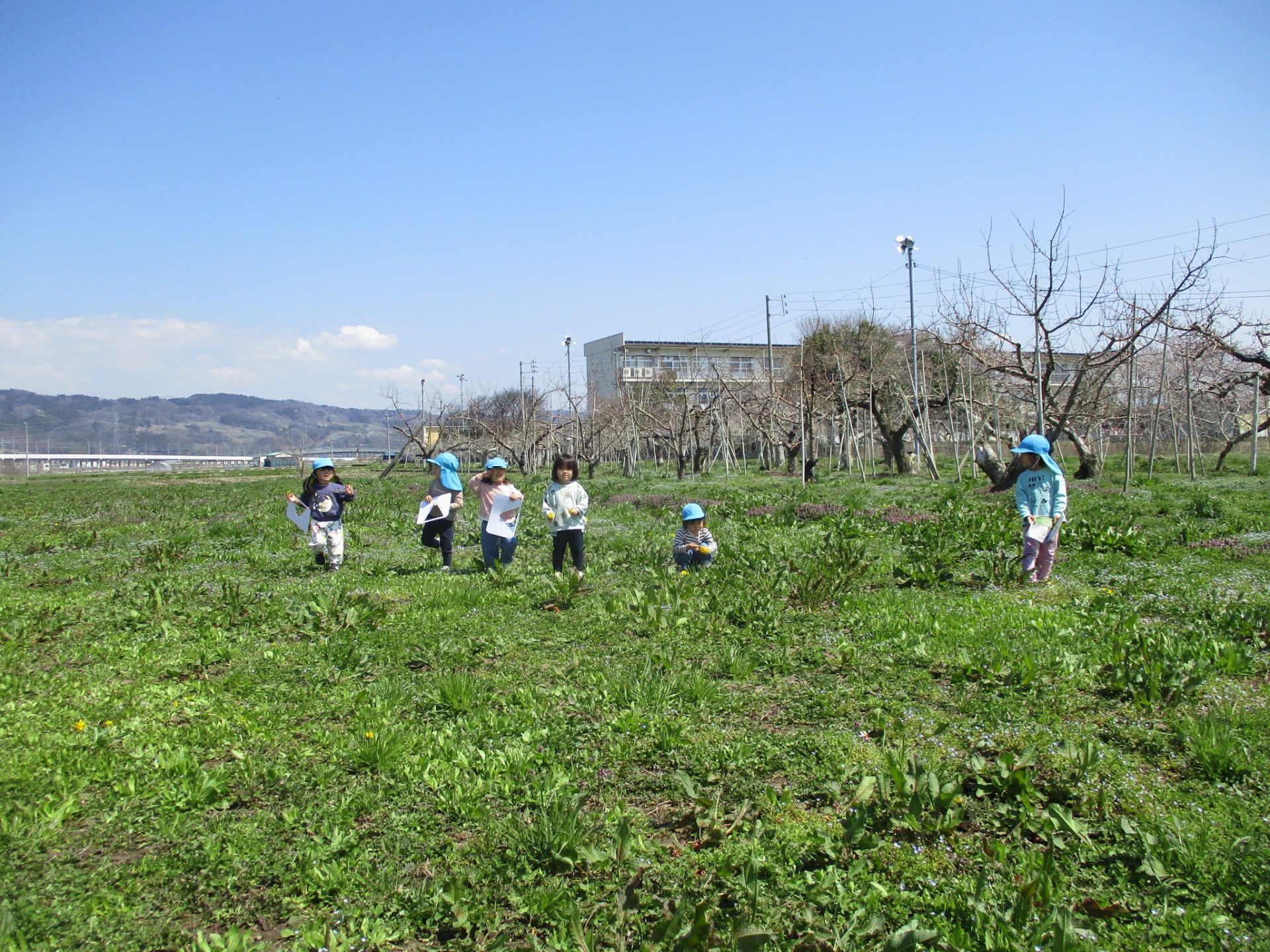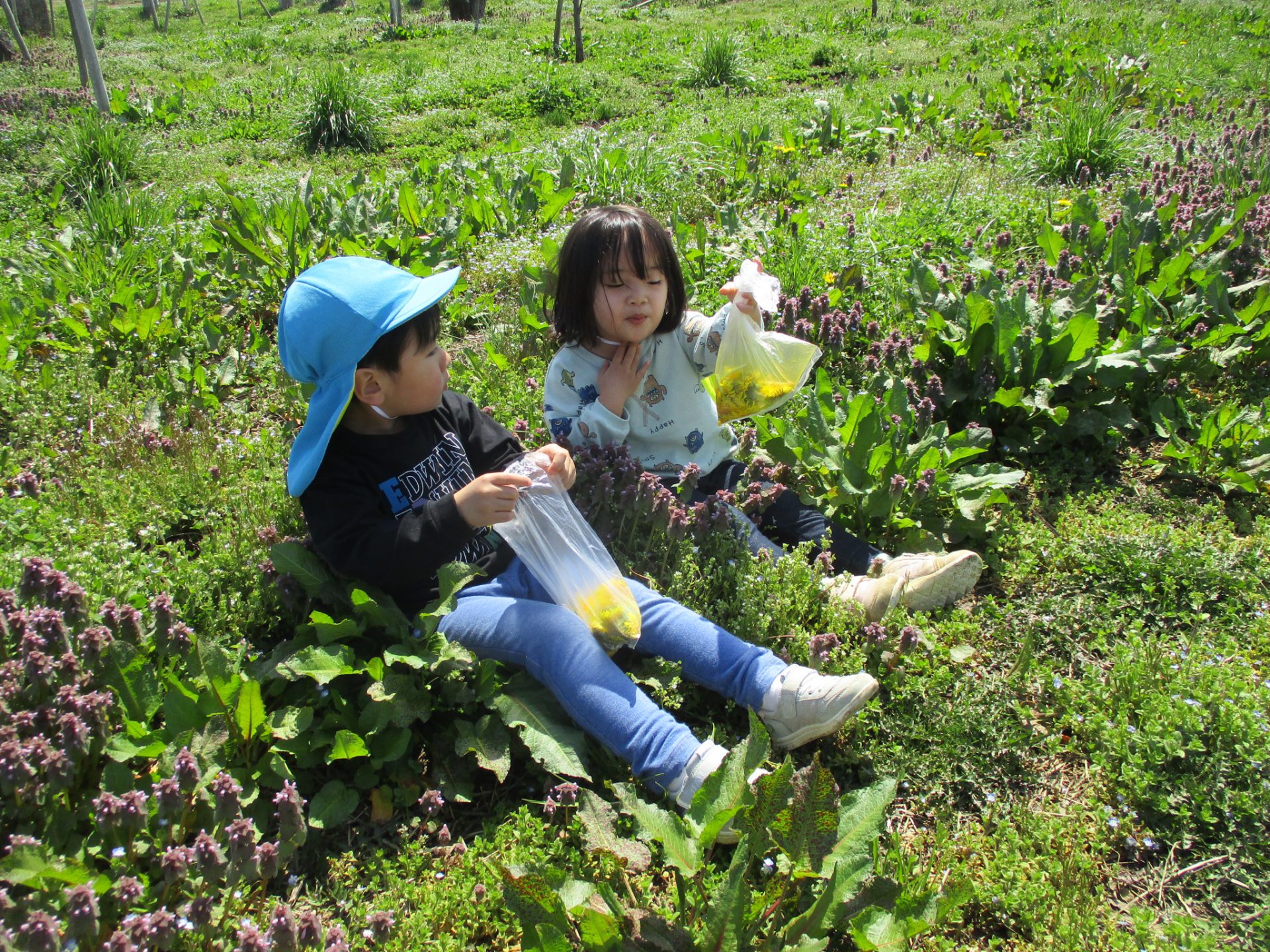 4月 ポカポカ陽気の中、保育園の近くの野原へお散歩に行きました。