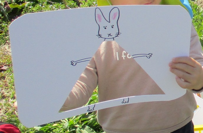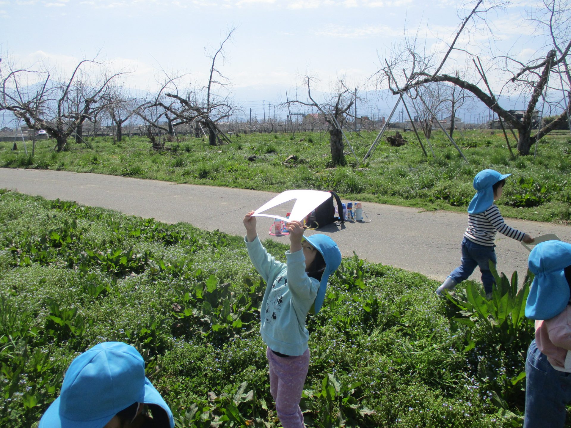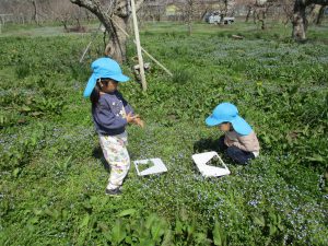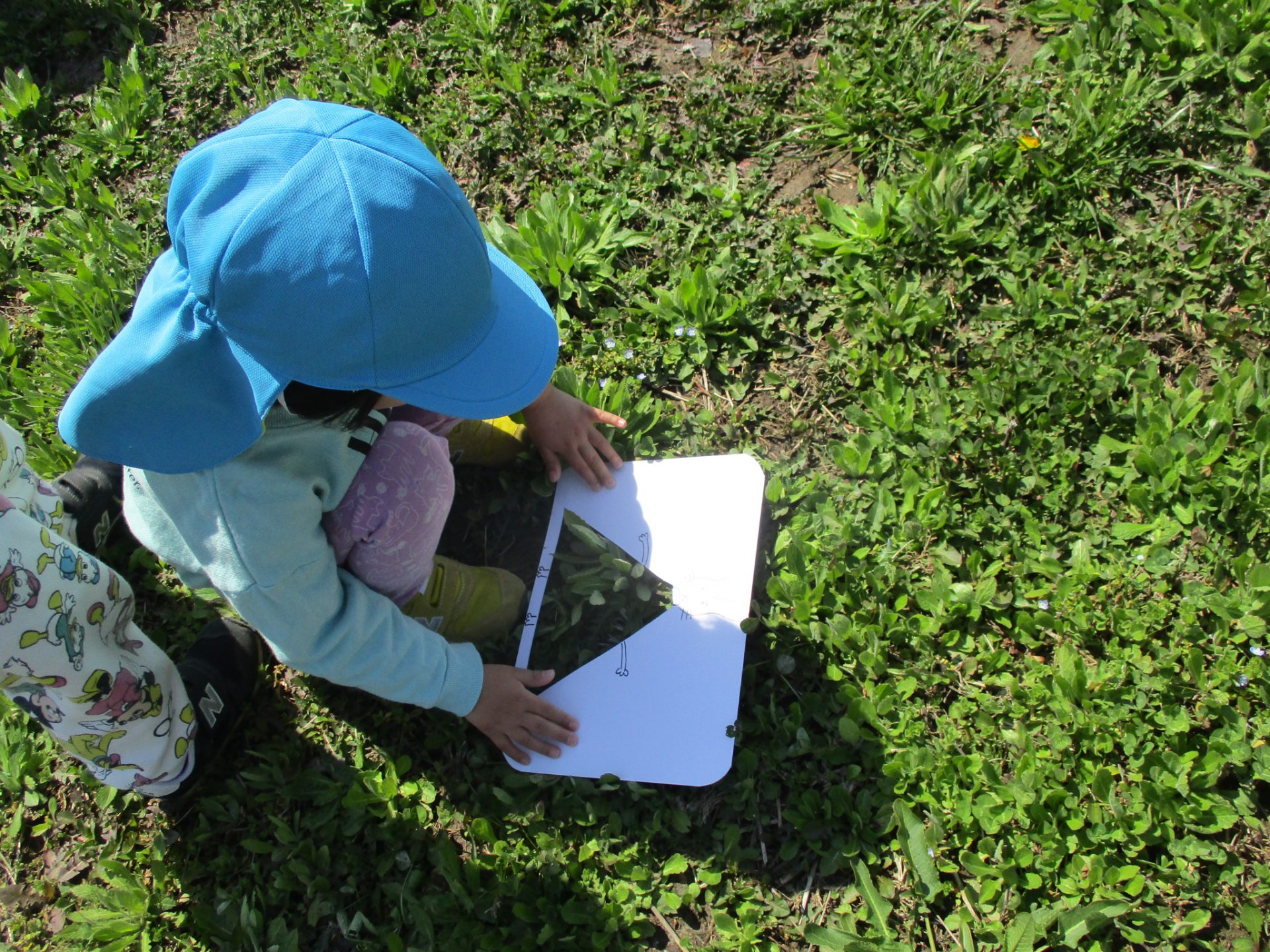 子ども達がフレームを草花や地面、空などにあてて楽しむ姿があり、いつもと違った発見ができました。