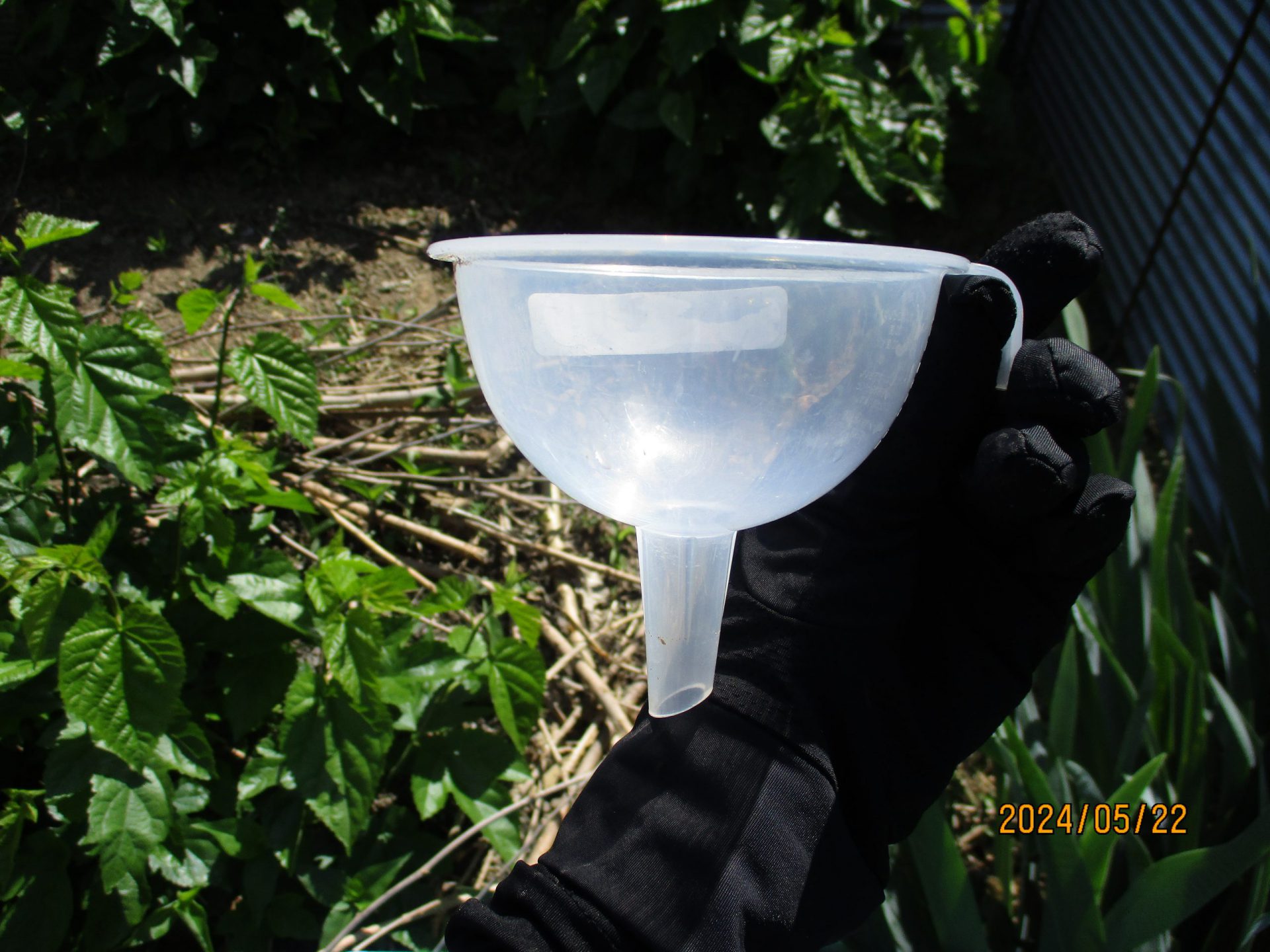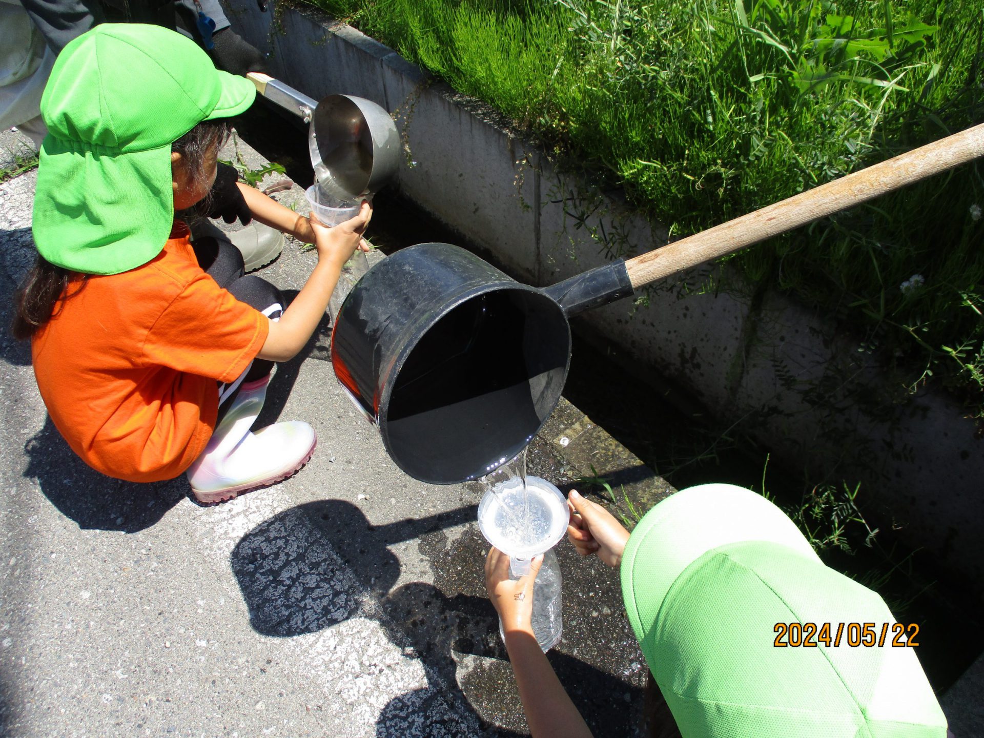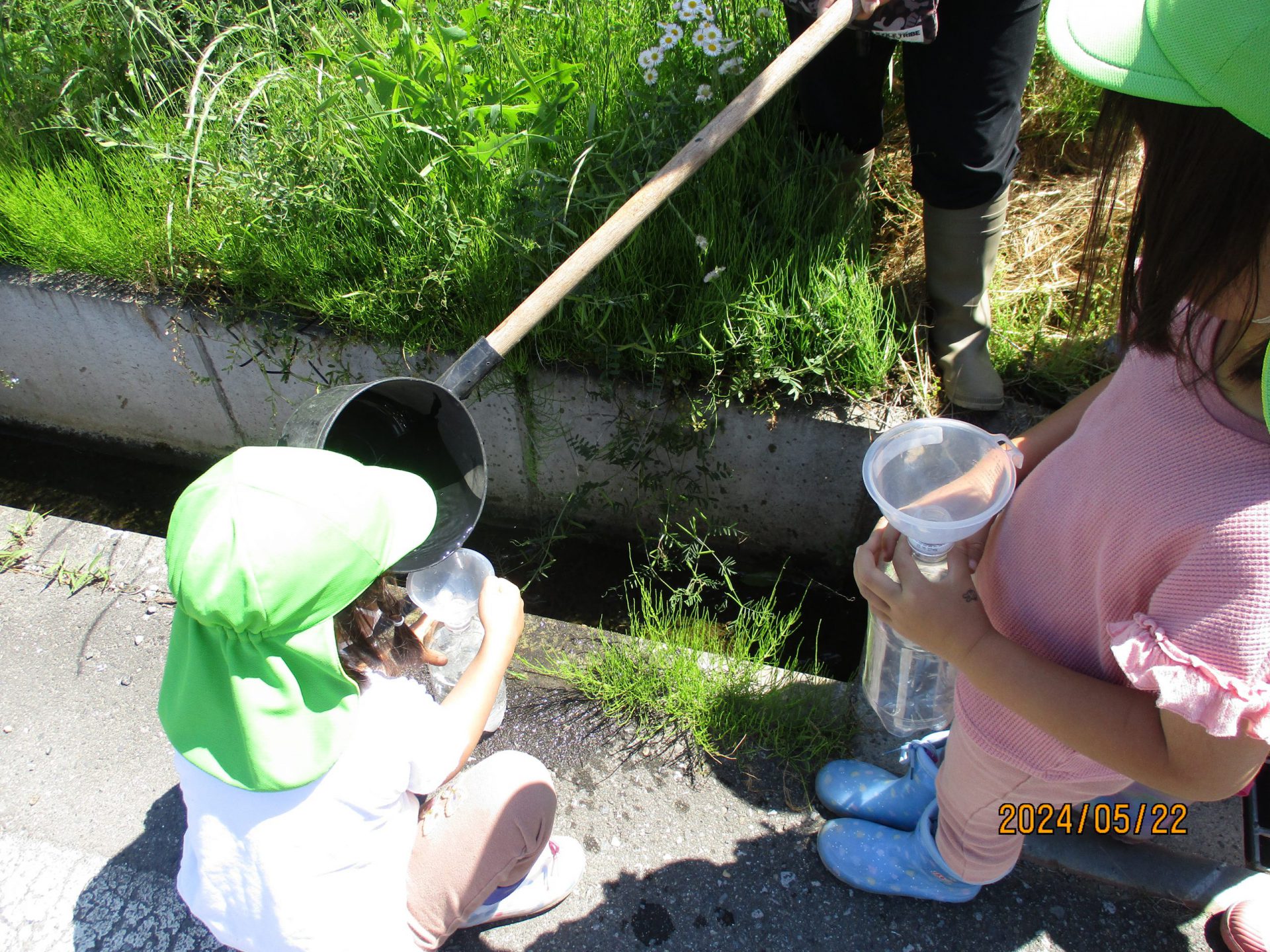 近くの用水路から水をくみ上げてペットボトルで運びます。