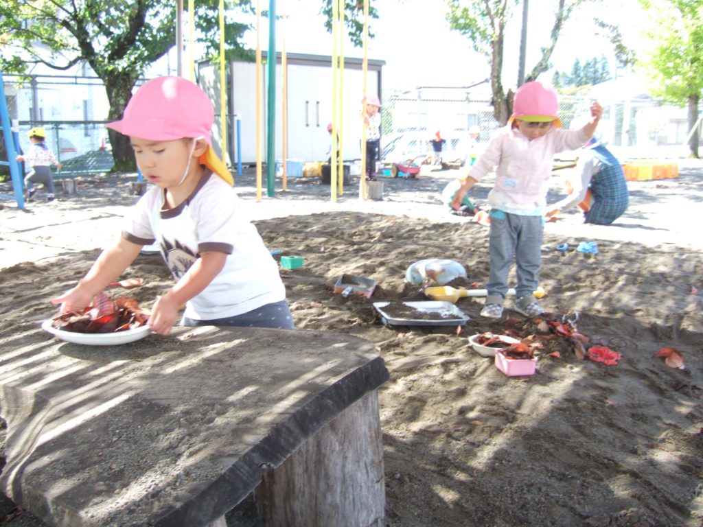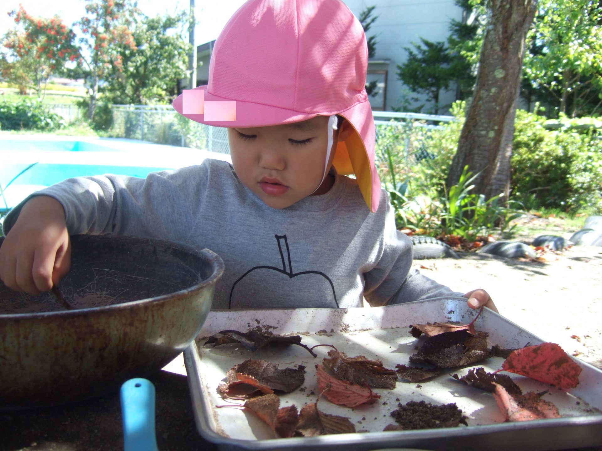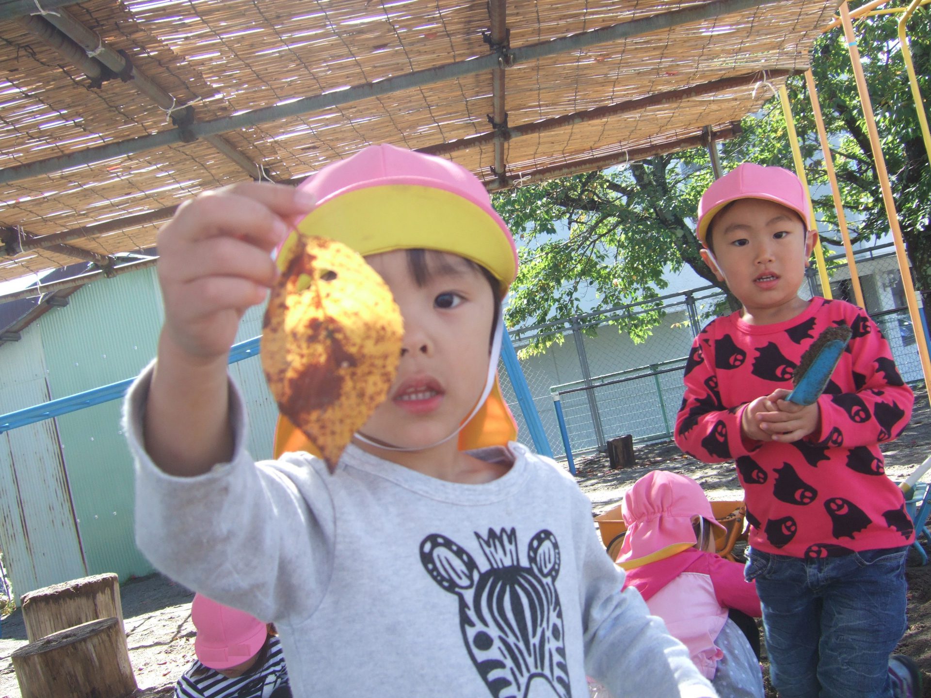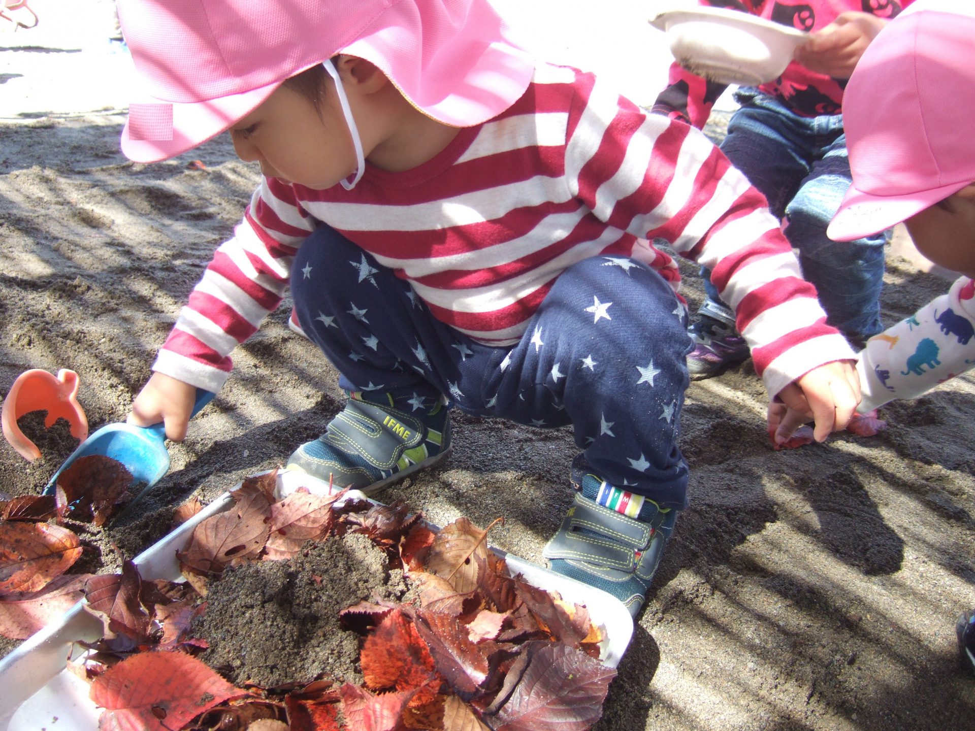 園庭で遊んでいく中で、葉、花びら、虫など一人ひとりが様々な秋の自然に興味を示し、見たり拾ったり見立てたりして遊んでいます。一人ひとりの発見や驚きを共有しながらこれからも秋探しを楽しめるよう、戸外遊びやお散歩に出かけ豊かな自然に触れ合っていこうと思います。
