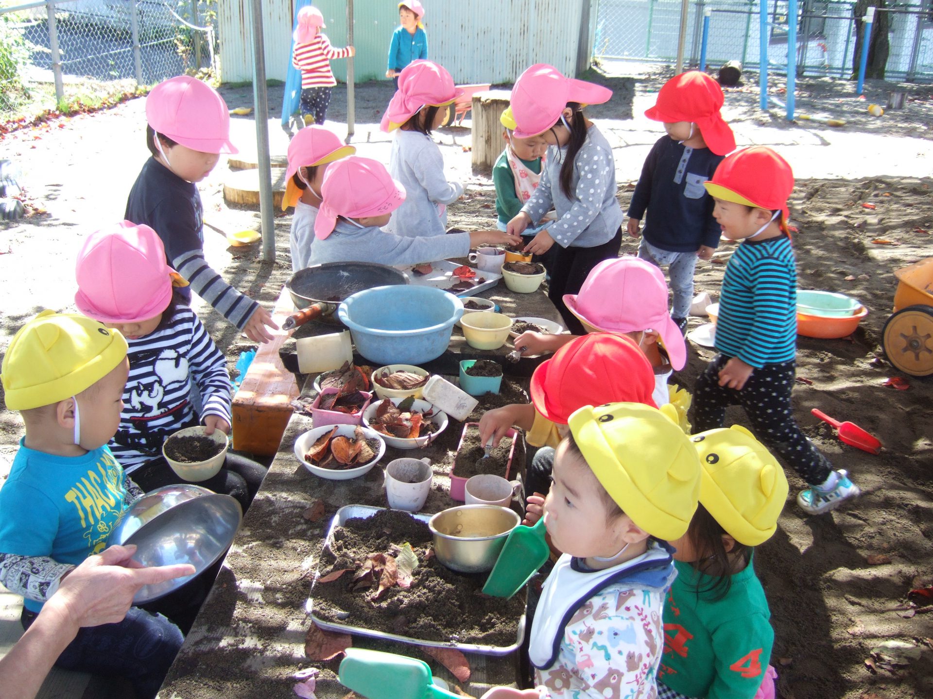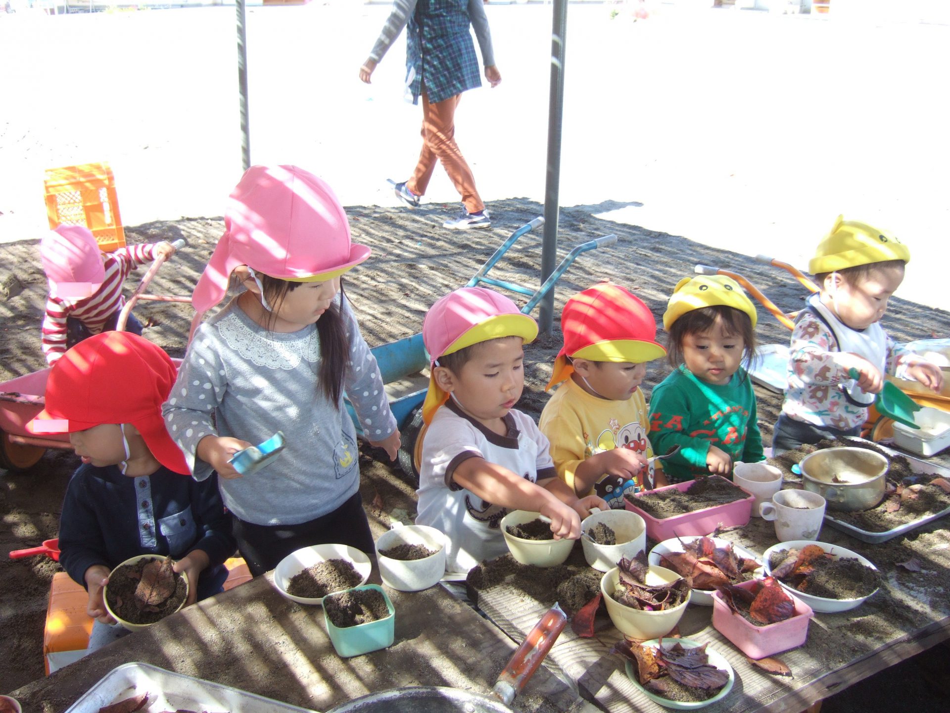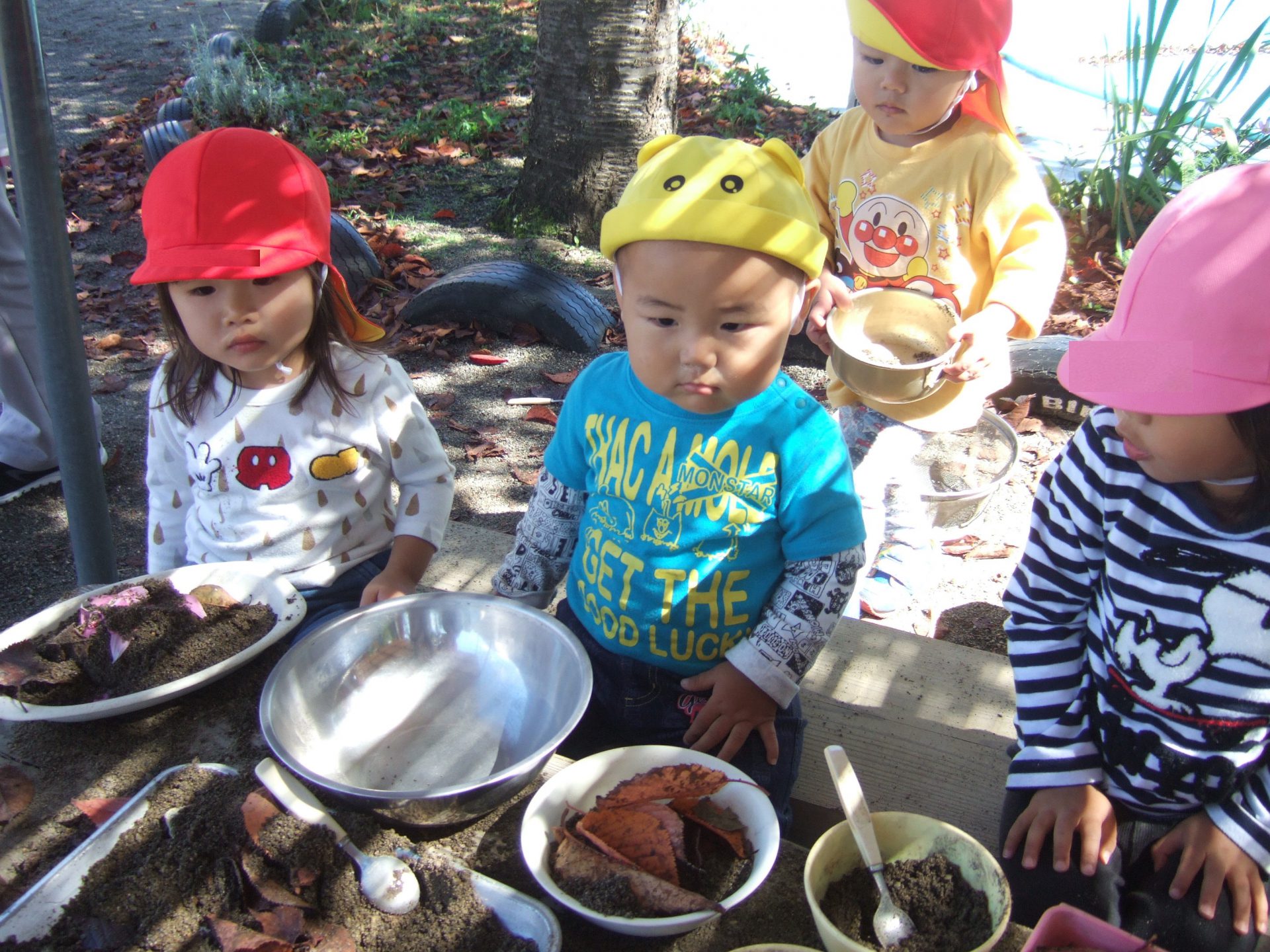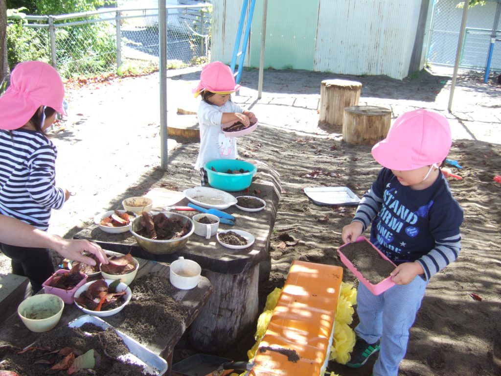 園庭で遊んでいく中で、葉、花びら、虫など一人ひとりが様々な秋の自然に興味を示し、見たり拾ったり見立てたりして遊んでいます。一人ひとりの発見や驚きを共有しながらこれからも秋探しを楽しめるよう、戸外遊びやお散歩に出かけ豊かな自然に触れ合っていこうと思います。