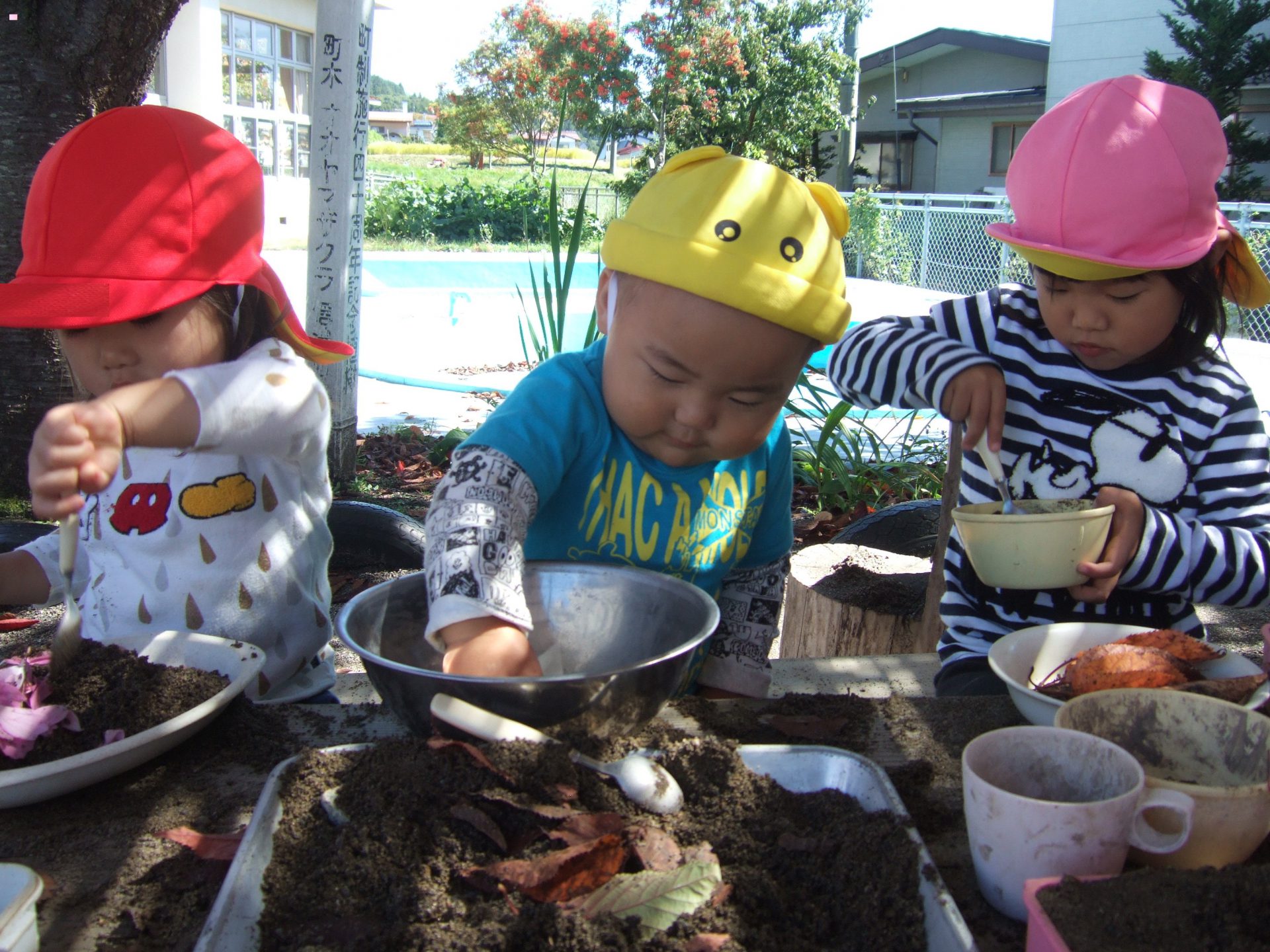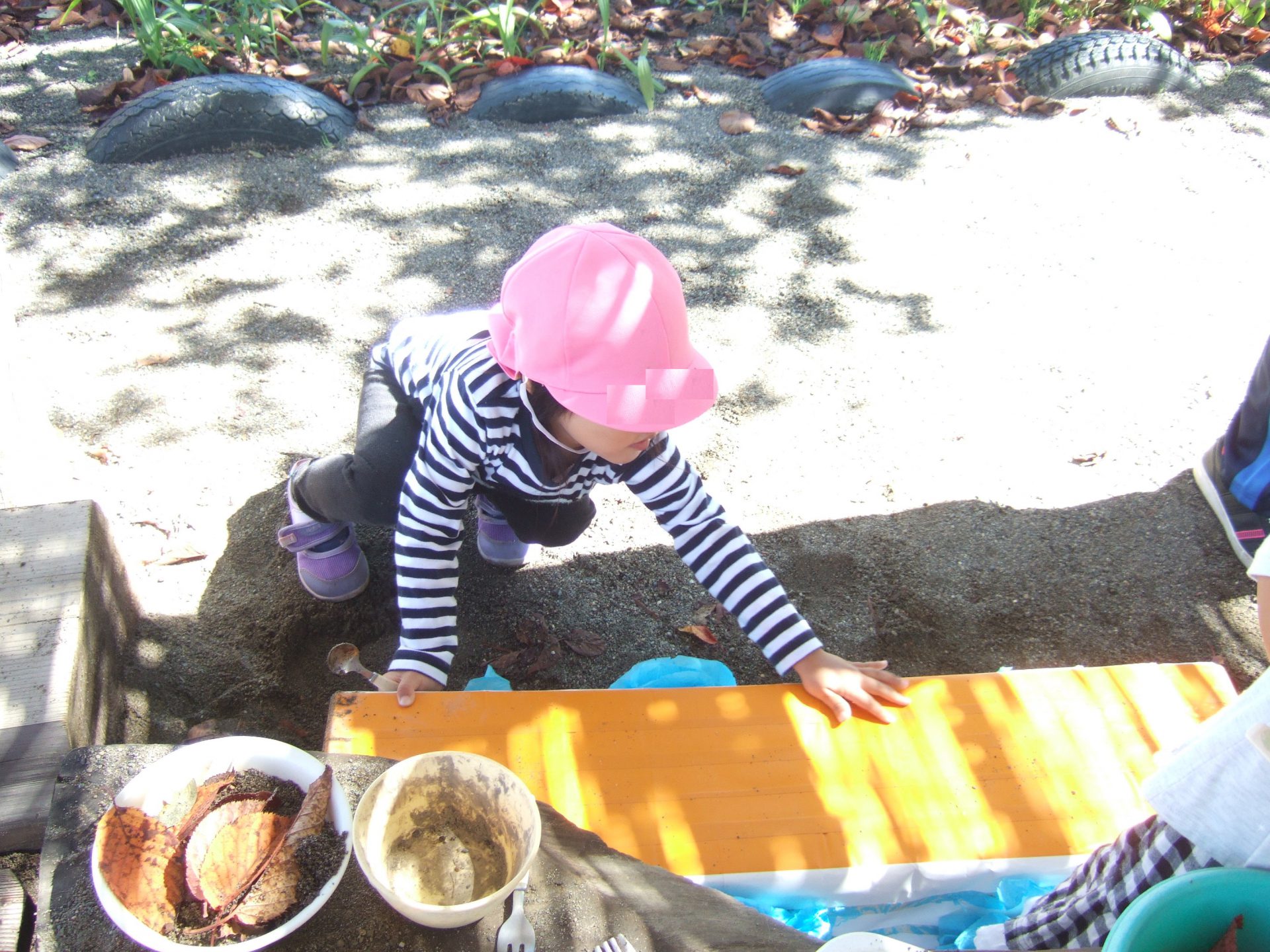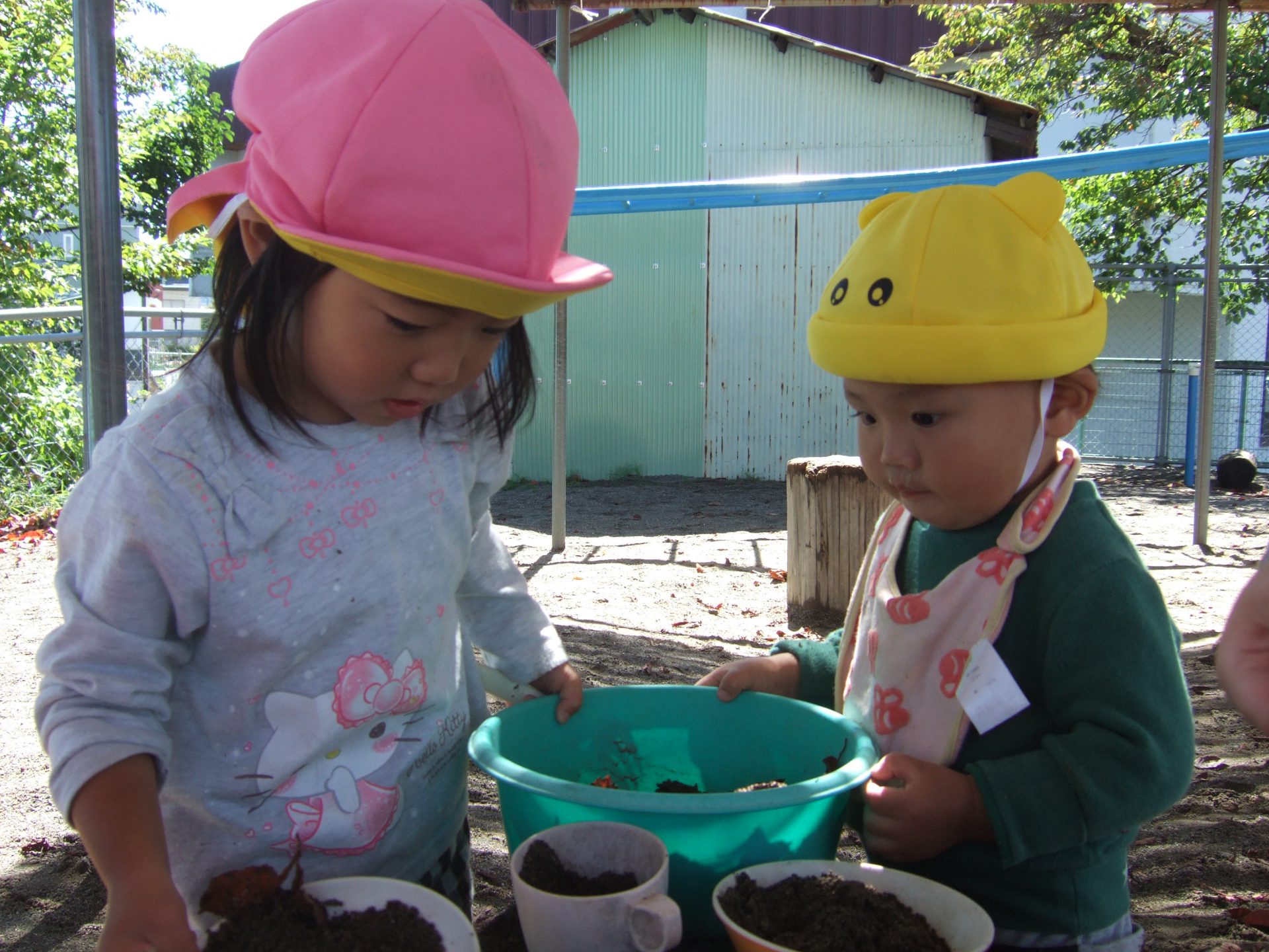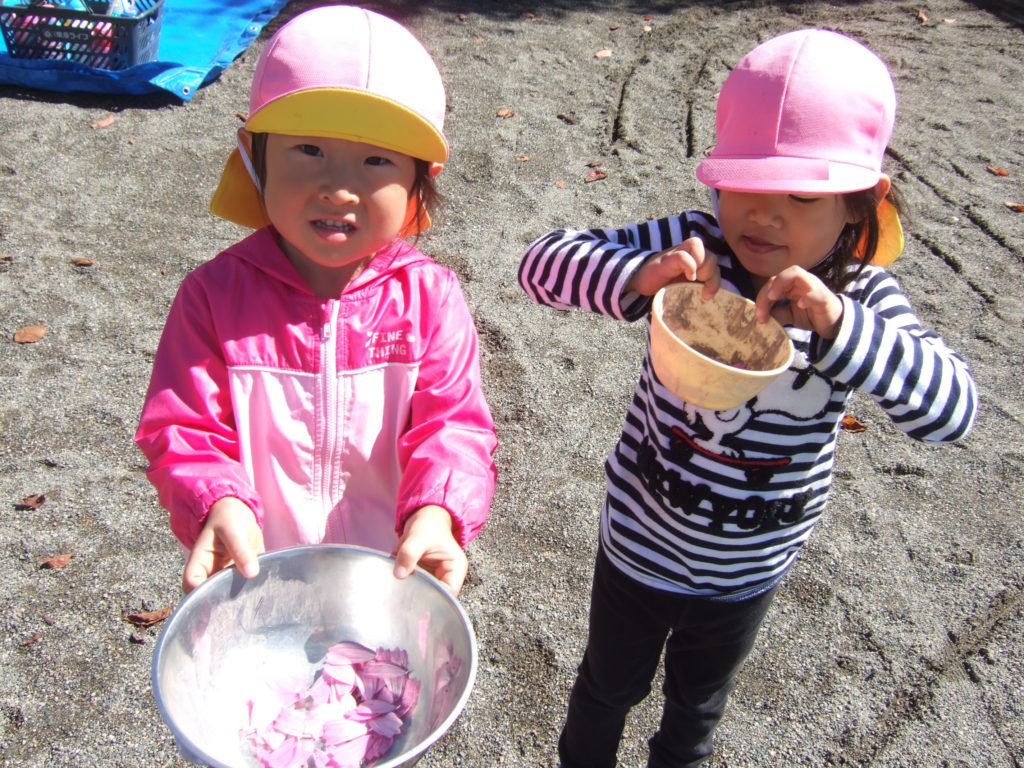 園庭で遊んでいく中で、葉、花びら、虫など一人ひとりが様々な秋の自然に興味を示し、見たり拾ったり見立てたりして遊んでいます。一人ひとりの発見や驚きを共有しながらこれからも秋探しを楽しめるよう、戸外遊びやお散歩に出かけ豊かな自然に触れ合っていこうと思います。