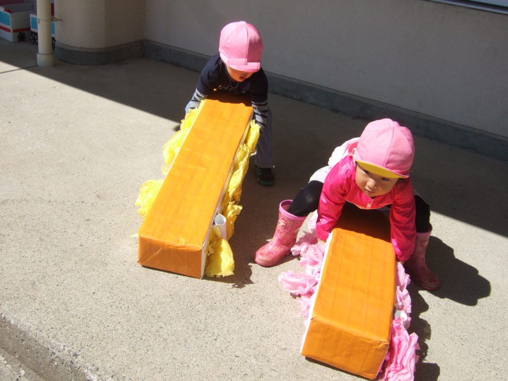 また、お友達の遊びを真似てみたり、「どうぞ」「ありがとう」とやりとりをしたりして一緒に楽しんでいる姿が見られて嬉しく思いました。これからも同じ遊びをじっくり楽しめるような環境を工夫したり、保育士も一緒にやりとりを楽しんだりしながら、お友達と遊ぶのって楽しいな!という経験をたくさんつんでいきたいです。
