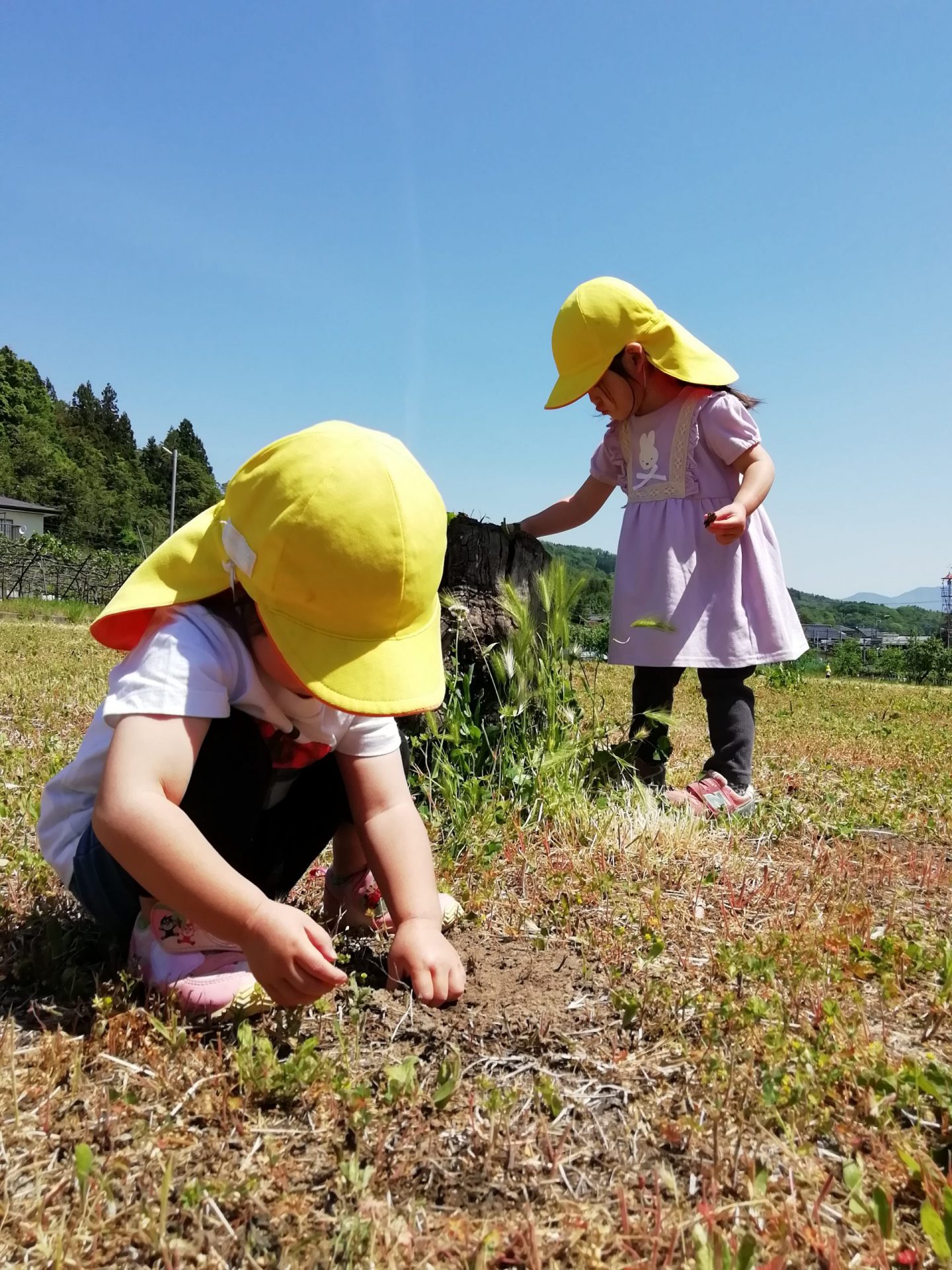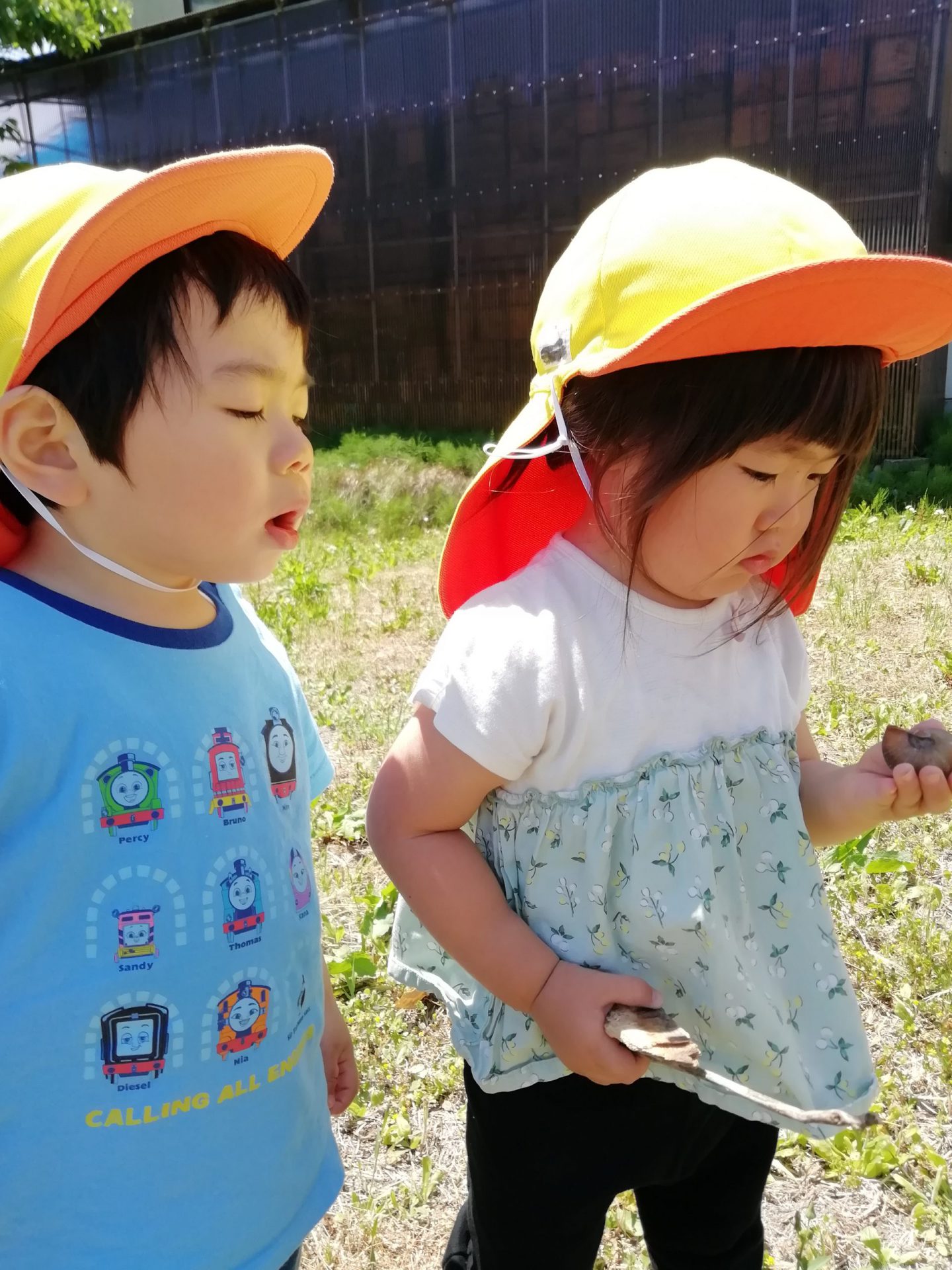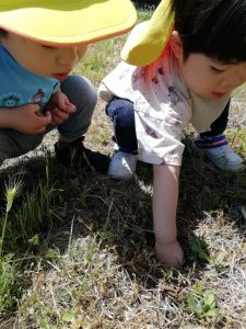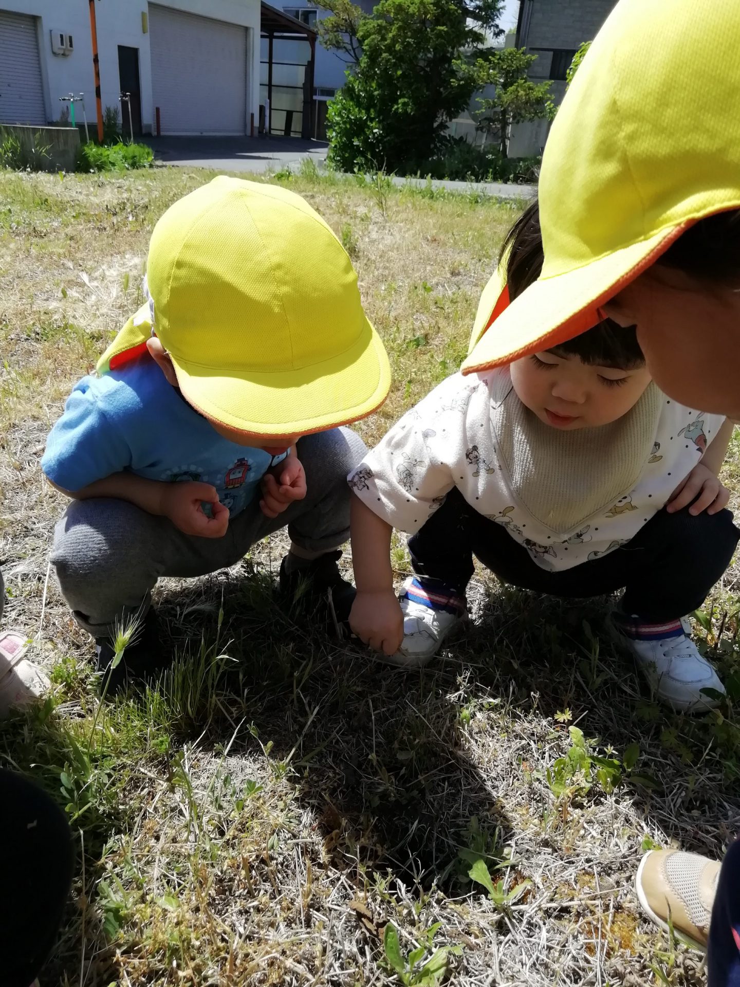 一人が何かを発見すると、近くにいた友達も「なになに?」とすぐに近くに来て、みんな同じ目線で発見を共有しています。保育者自身も子ども達と同じ目線でたくさんの発見を共有していきたいなと思いました。戸外で遊ぶ気持ちの良い季節。今後も四季を感じながら過ごしていきたいです。