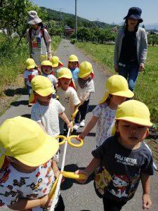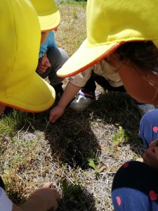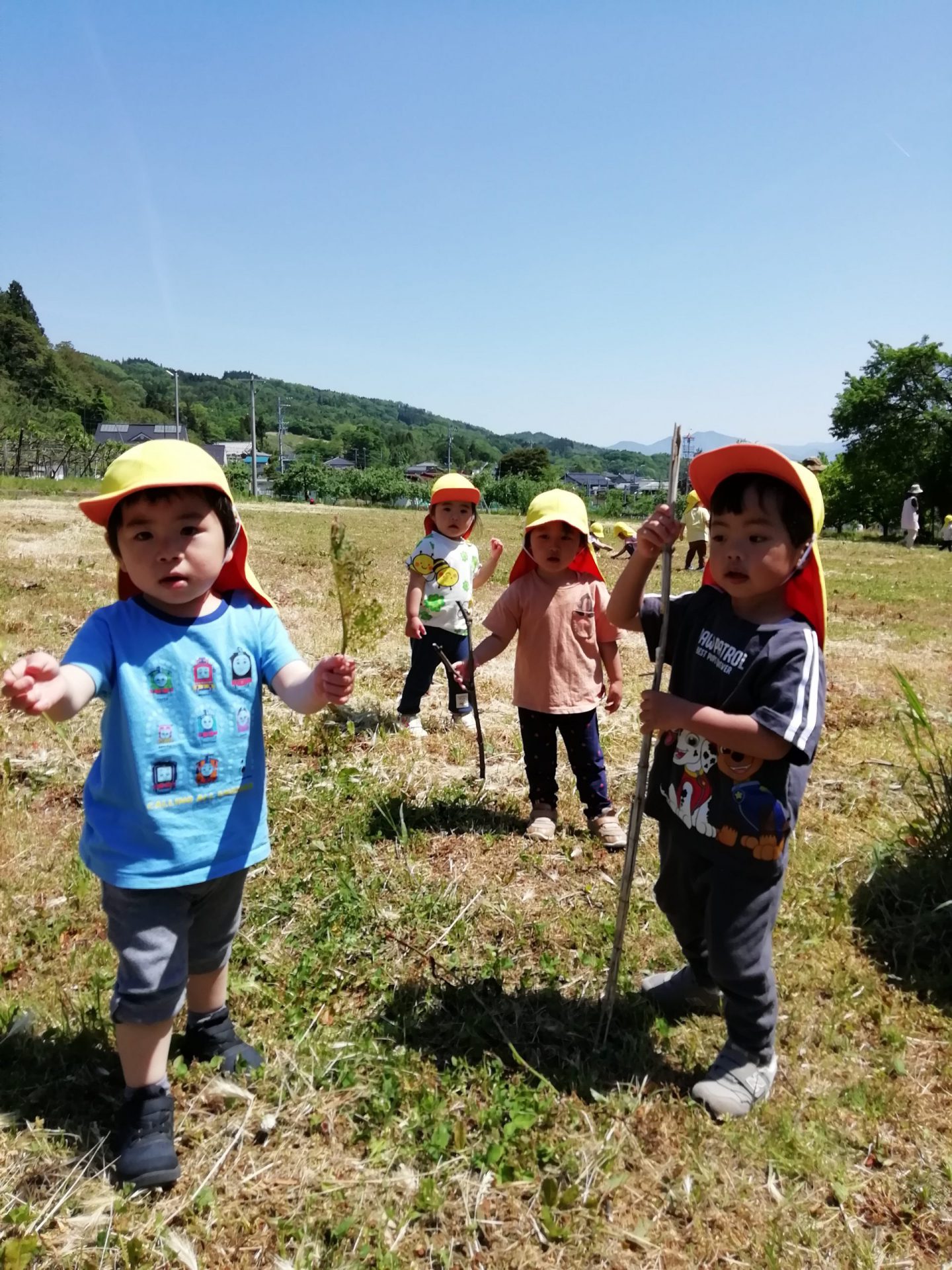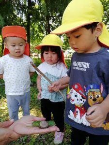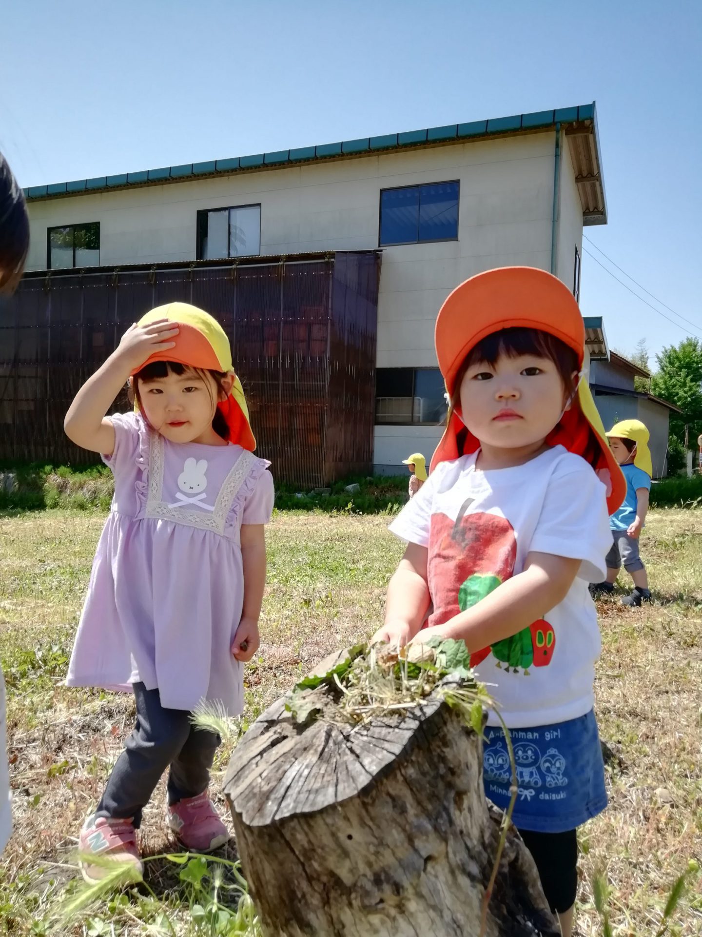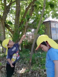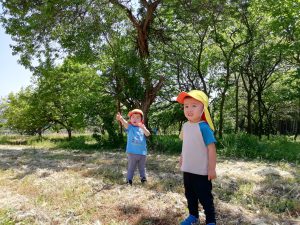 一人が何かを発見すると、近くにいた友達も「なになに?」とすぐに近くに来て、みんな同じ目線で発見を共有しています。保育者自身も子ども達と同じ目線でたくさんの発見を共有していきたいなと思いました。戸外で遊ぶ気持ちの良い季節。今後も四季を感じながら過ごしていきたいです。