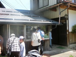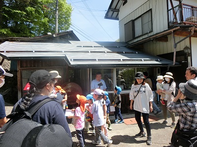 中をじーっと覗いて見ますが、子どもたちはわからない様子。おうちの人に聞いてみると知っている人がいました。答えは「豆腐屋さん」まだ道具が中にあるので、みんな興味津々で見ていました(子どもより大人の方が夢中で見ていました)。