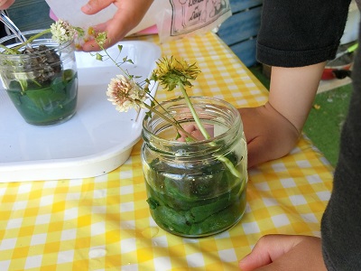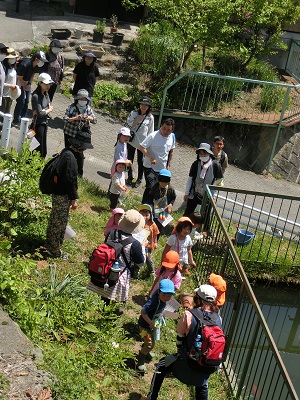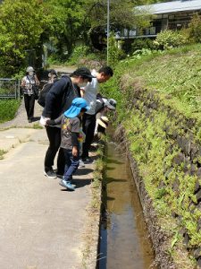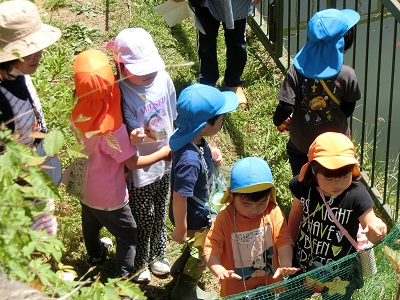 道中草花を摘んだり、虫を発見したり、保育園周辺の環境を学びながら、楽しい親子参加になりました。