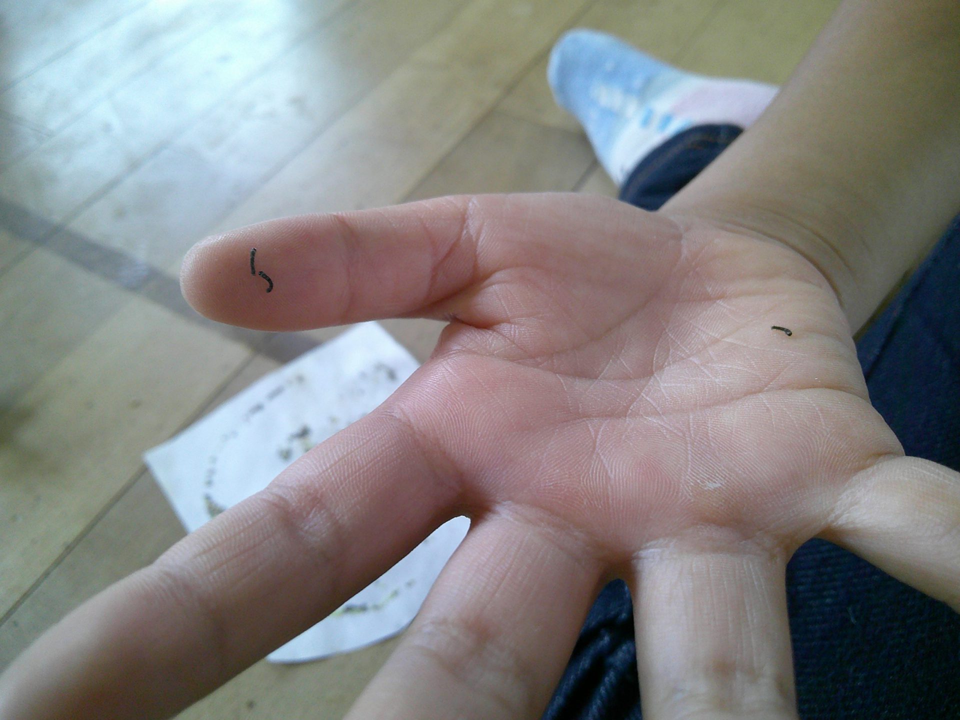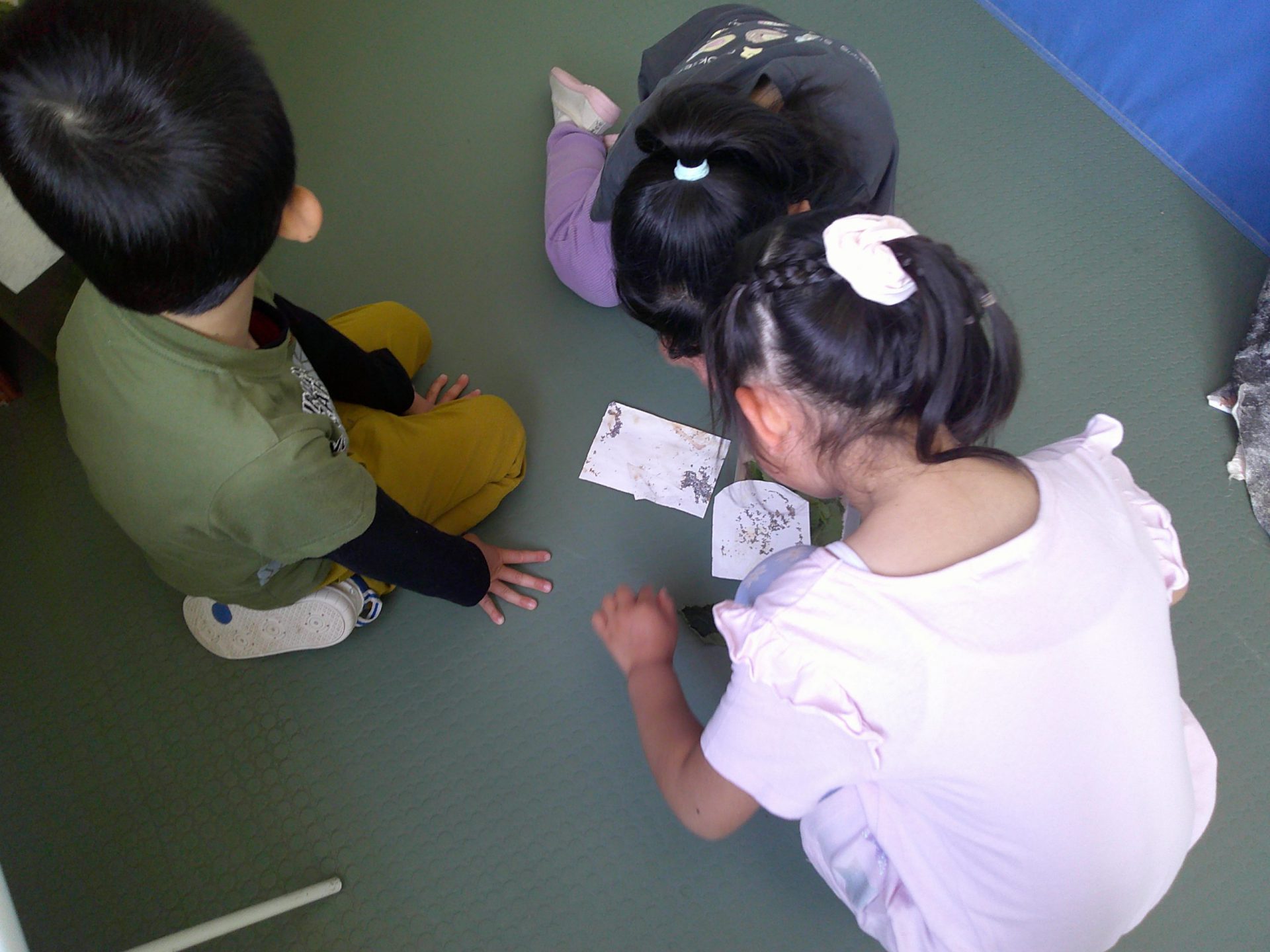 ・「大きいときは白色なのに、小さいときは黒色なんだ!」と色の違いに気づく子もいました