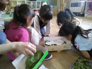 ・まだ触るのが少し怖い友達も、「わたしは葉っぱをとってきたよ」と一緒に世話をしてくれる姿がありました
