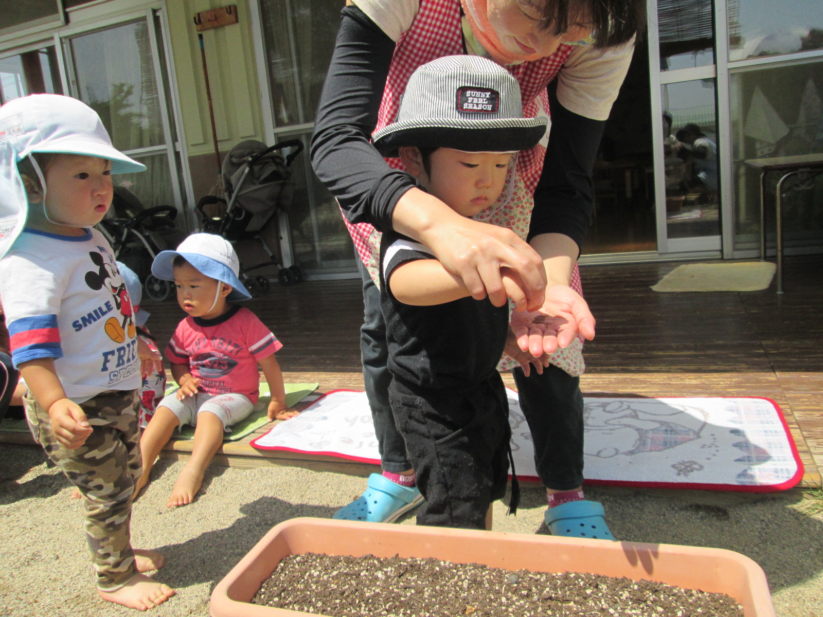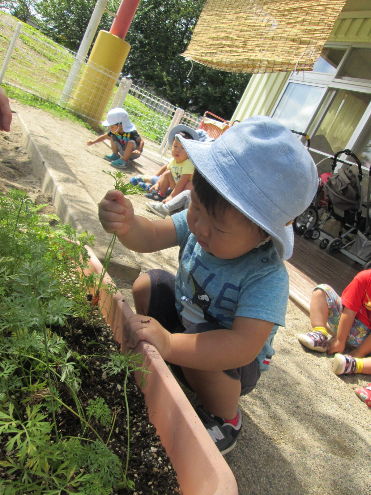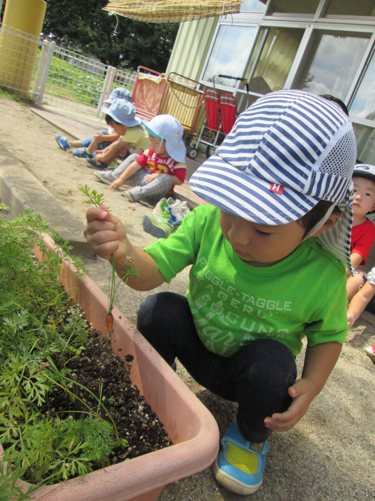 「人参さん、大きくなったかなぁ~。抜いてみよう。」プランターの周りに集まるこども達。