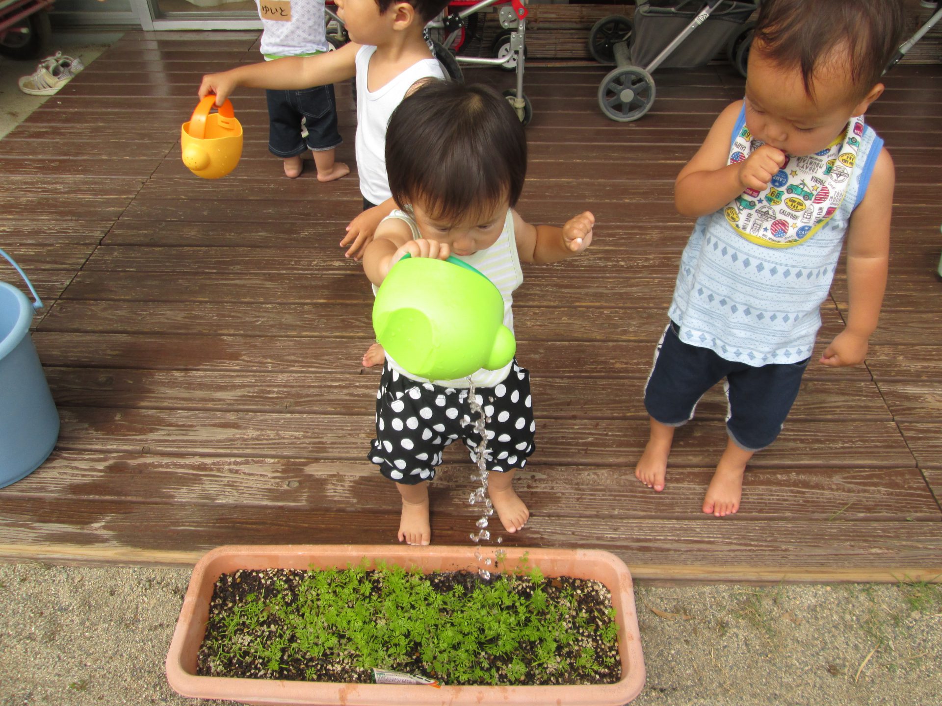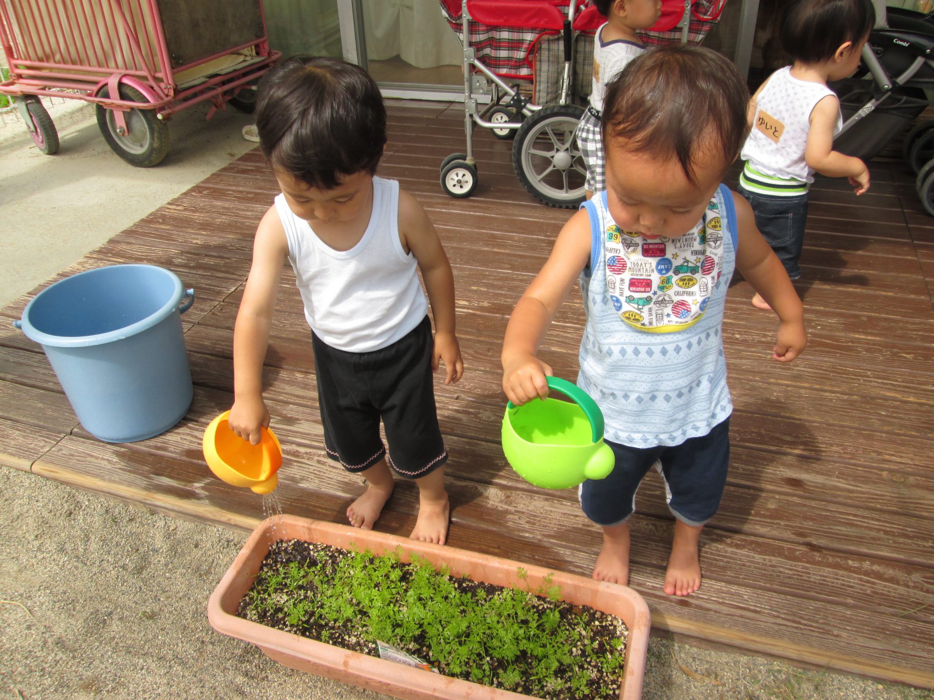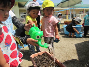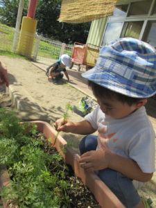 小さい子ども達ですが、水遊びでなく、『人参にお水をあげる』という思いで水やりをしていました。こういうことを通して、野菜に親しんでほしいと思いました。自分の採った人参の味は別格だったと思います。野菜のおいしい味も知ってほしいと思いました。