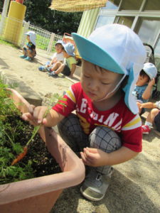 人参の種を蒔くところから、人参が育っていくところを見てきました。そして、自分たちが育てた人参を給食の時間においしくいただきました。「〇〇ちゃんがお水あげた人参だよ。」と声をかけると、「〇〇の人参!」と喜んでいました。普段、野菜の苦手な子も「〇〇ちゃんが抜いた人参だよ。」と声をかけると、喜んで食べていました。その後、給食で人参が出ると「〇〇がお水あげた人参?」と聞くこども達です。