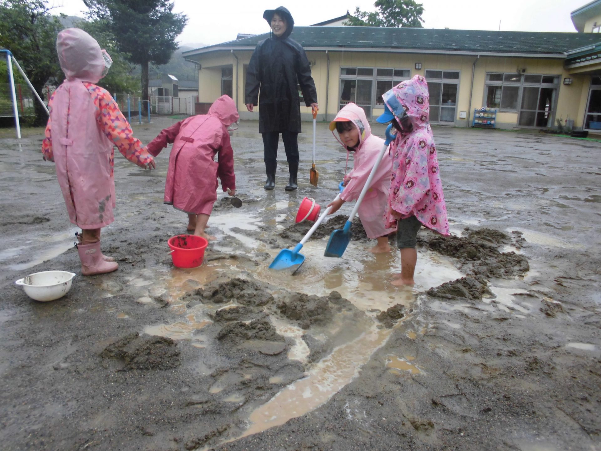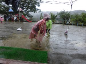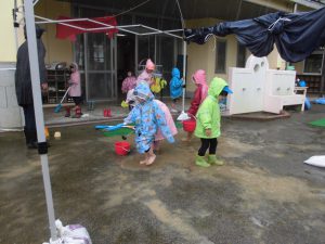 大雨でしたが、「カッパ着てけば出られるじゃん!」と、みんながやる気になっていたので、外に出てみました。