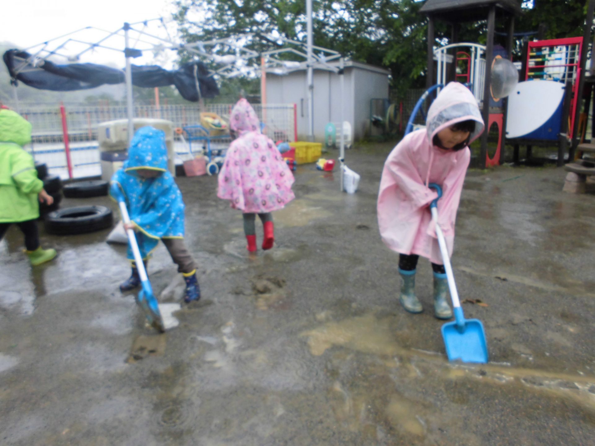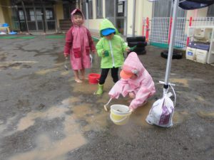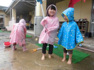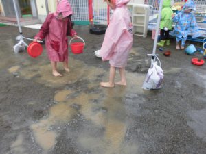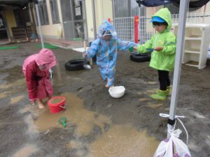 雨の園庭で、長靴はすぐぬれる。