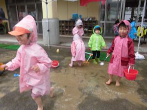 「まだどろんこ遊びの格好じゃないから、ちょっと雨に当たるだけにしようね」と言う話をして出ました。