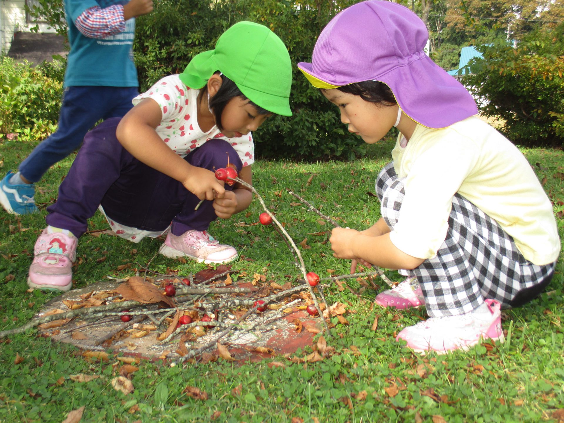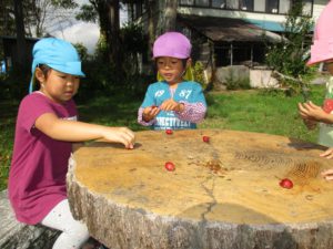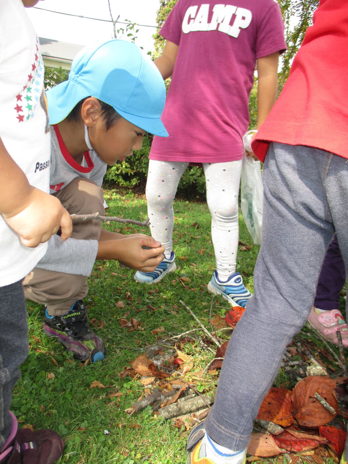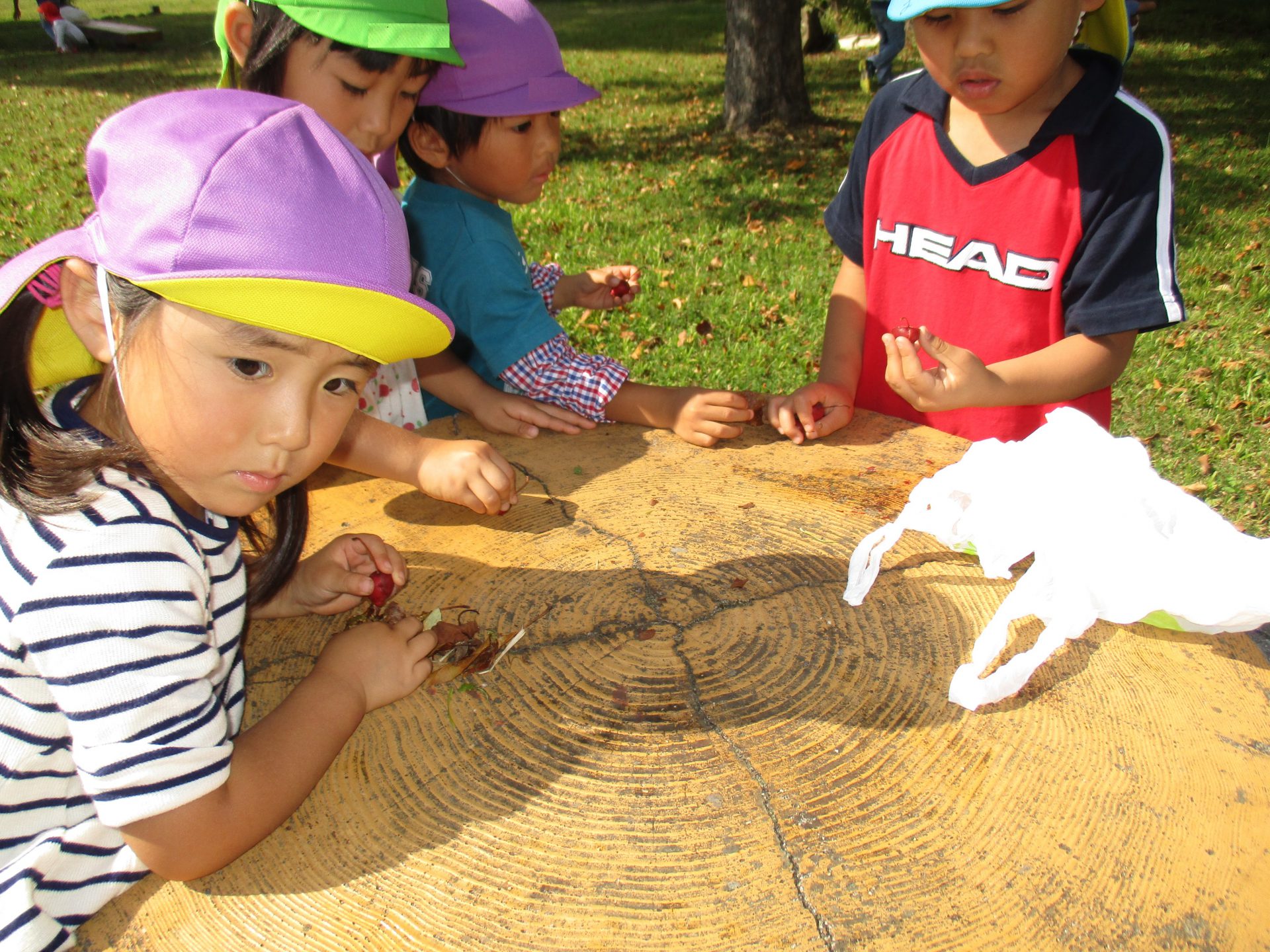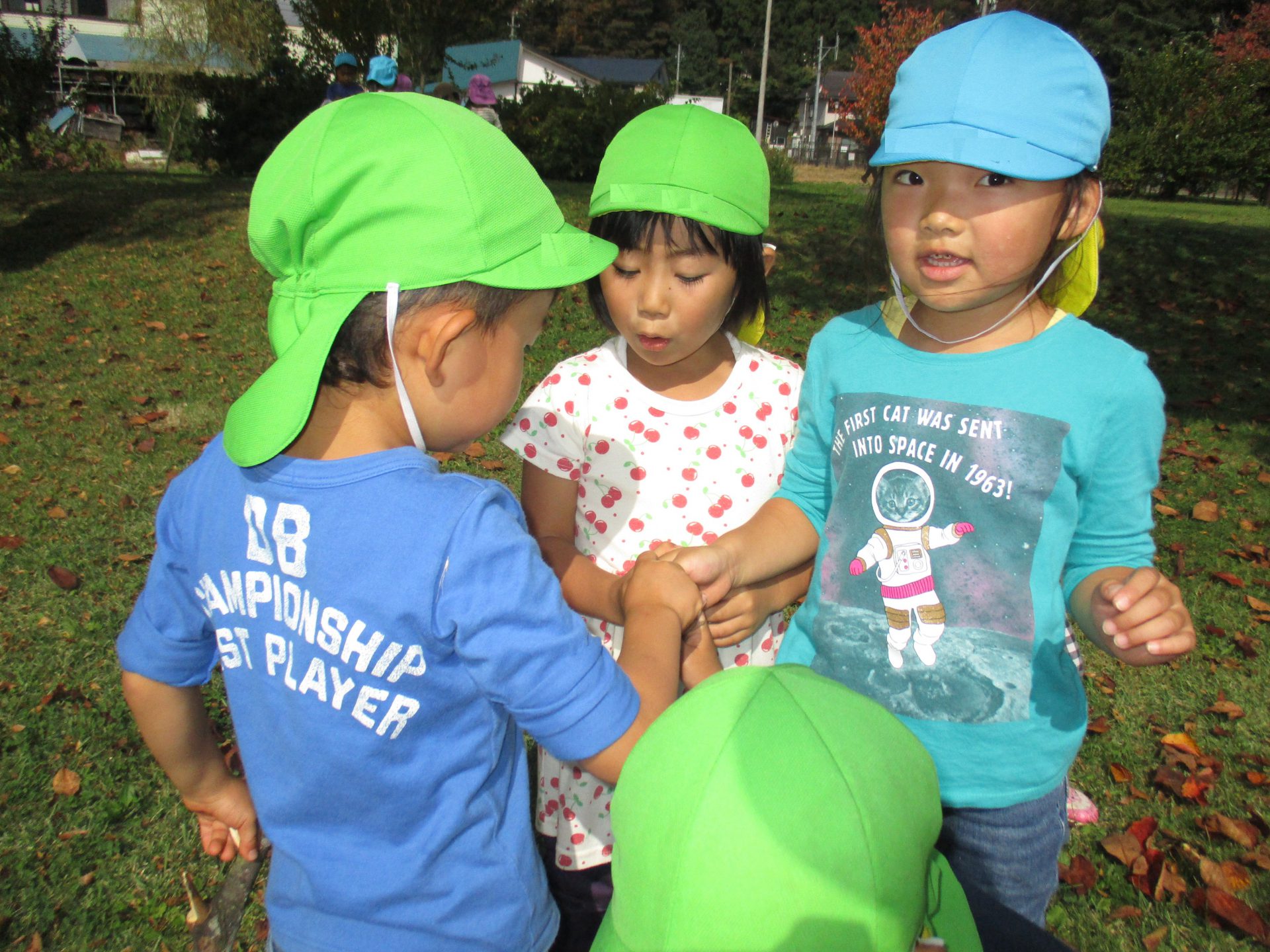 お散歩をしている時には、「この葉っぱ、赤くなってる。」「”紅葉”っていうんだよね」と、発見しお友だちと教えあう姿が見られました。子どもたちの発見・驚き・喜びを一緒に共有しながら、信濃町の秋を全身で感じたいと思います。