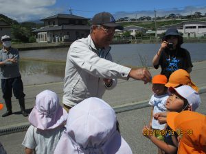 お手伝いをしてくれる皆さんにあいさつをして・・・苗の植え方を教えてもらいます
