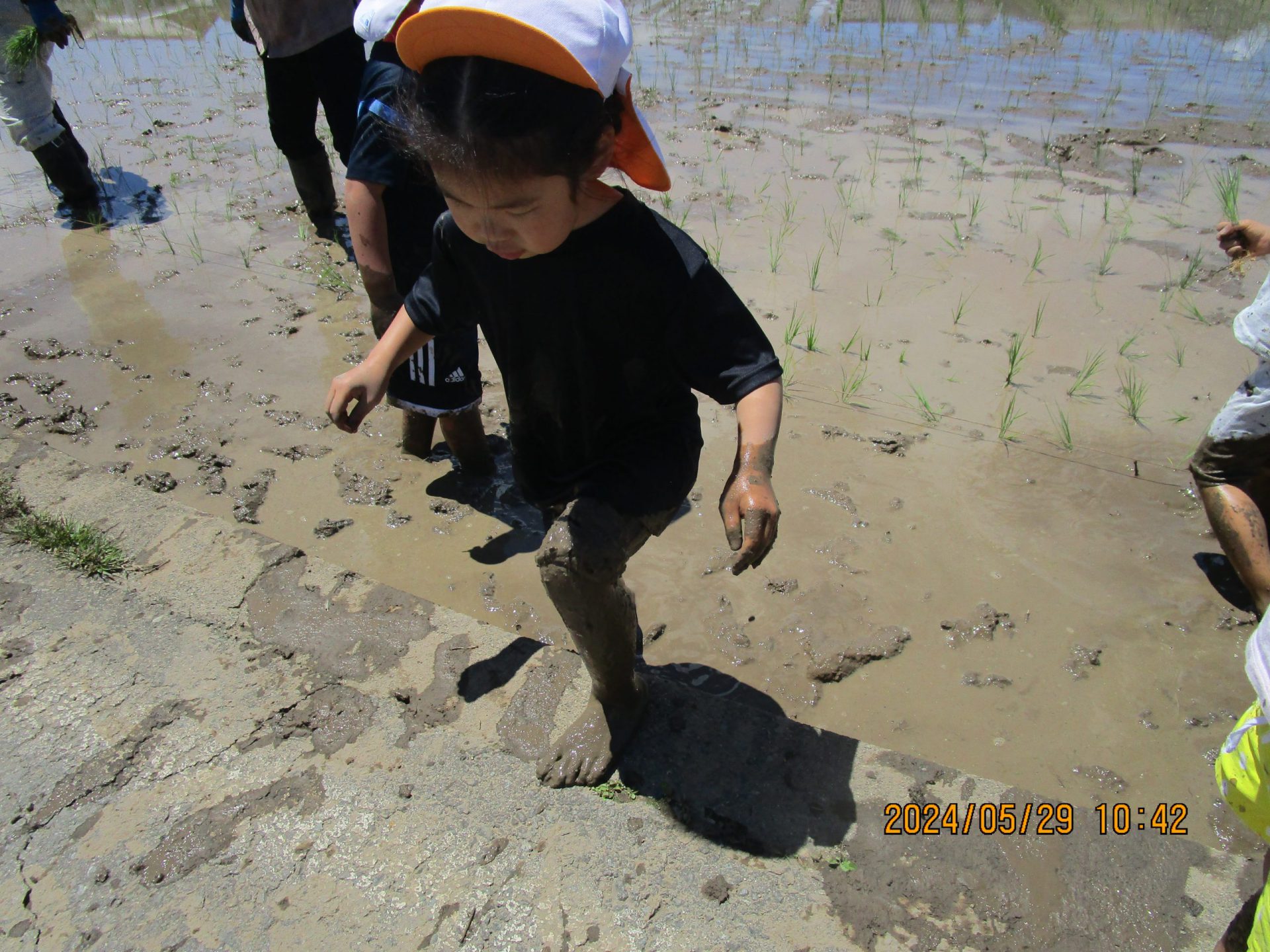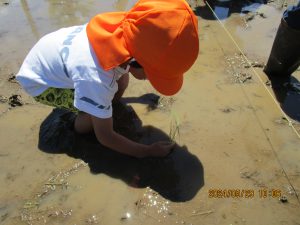 はじめて田んぼに足を入れる瞬間は、おっかなびっくり