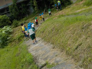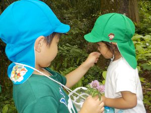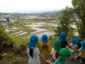 ・自然豊かな当地域でも、日頃歩くことが少なくなっています。自分の足で歩き、自分の目や鼻や、時には口で体験して感じることは、何よりの刺激となると、子どもの表情から感じられました。5区の公園は近くにありますが、そこへ辿り着くまでには保育士から聞いた草木の知識や、自分で発見した生き物達や、地域の方に声を掛けてもらう事など、子ども達の心身に溢れんばかりの刺激を受けたなあと思いました。 ・道中は、大人でも太ももの前側にしっかり力を入れないと滑りそうな山道や田んぼのあぜ道などがあります。子ども達は楽しみながら、また無意識の内に、体のあちこちに力を入れて鍛えられていると思いました。 ・公園からの帰り道、近くに住む方が「今度、草を刈っておいてやるな」と仰って下さいました。子ども達のために、常に声や気を掛けてくださっている、地域の方に感謝します。