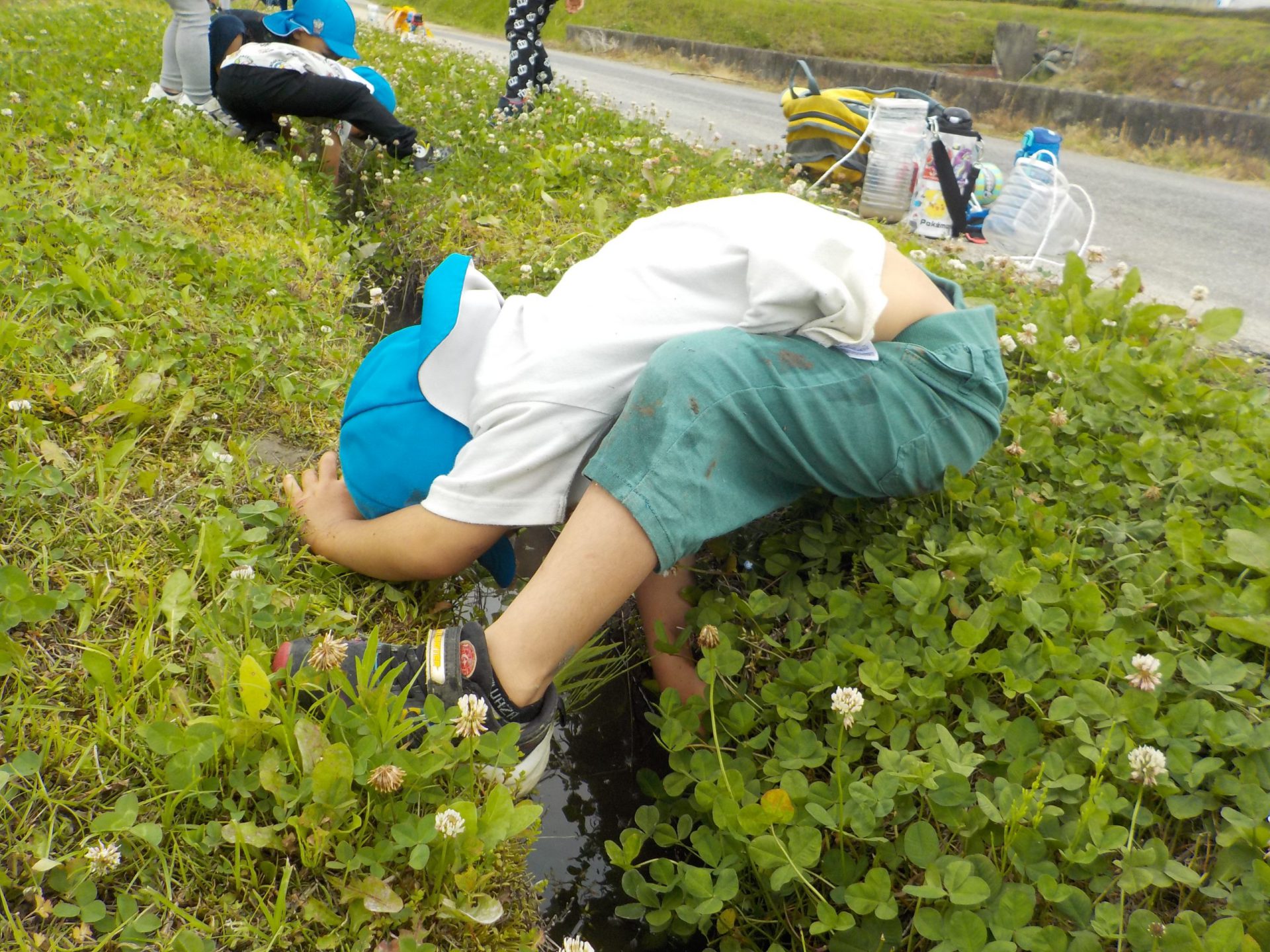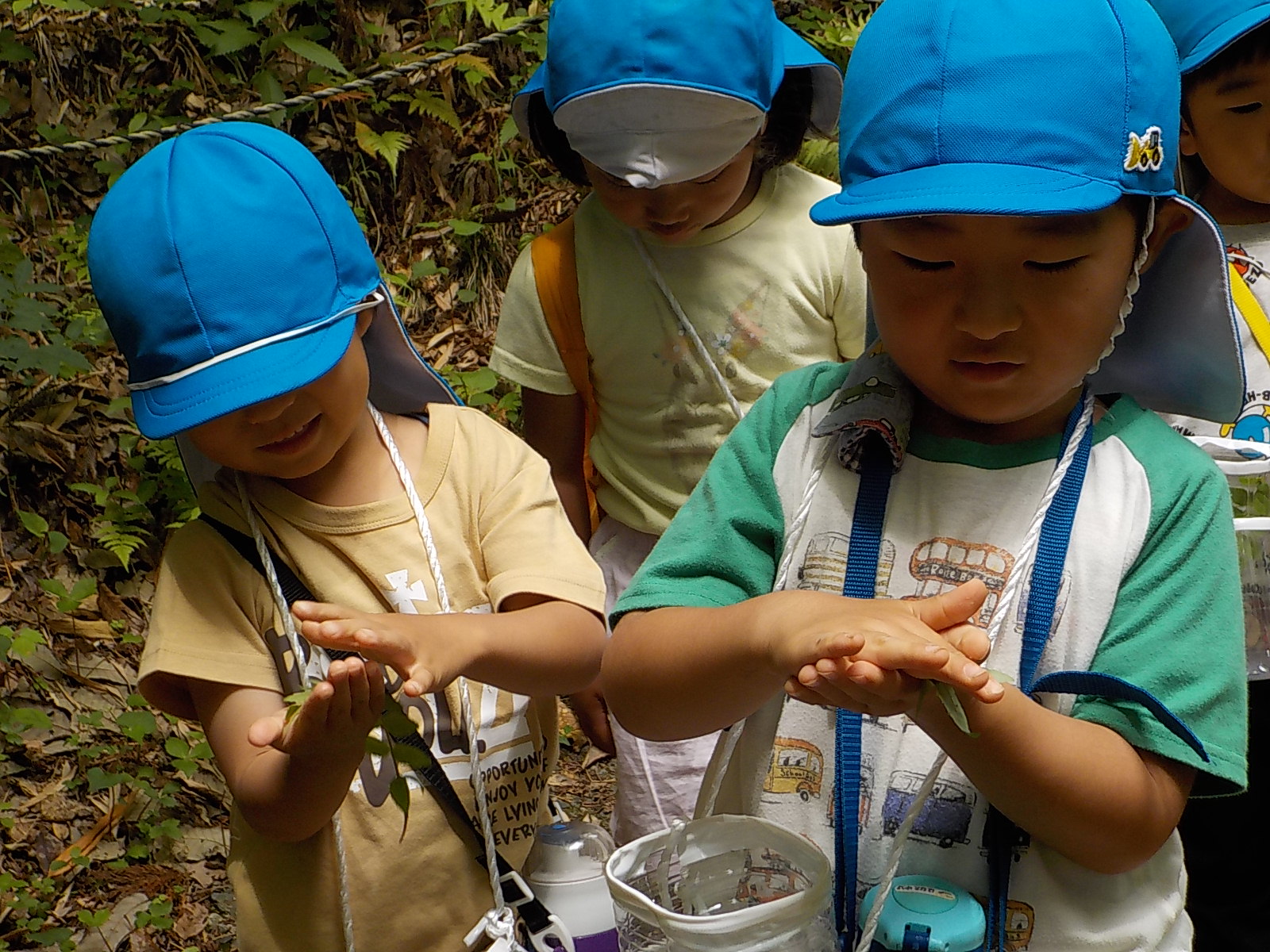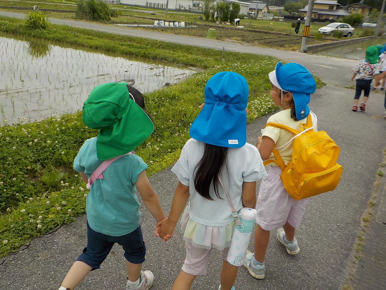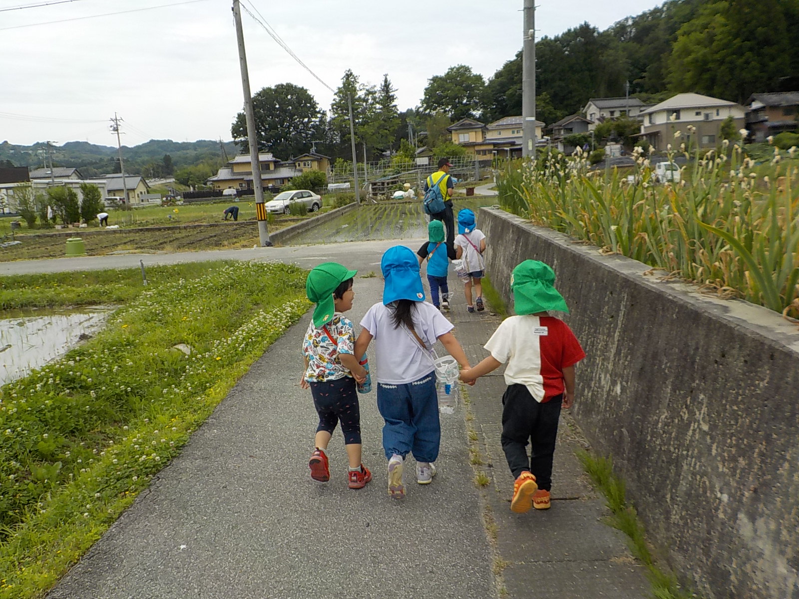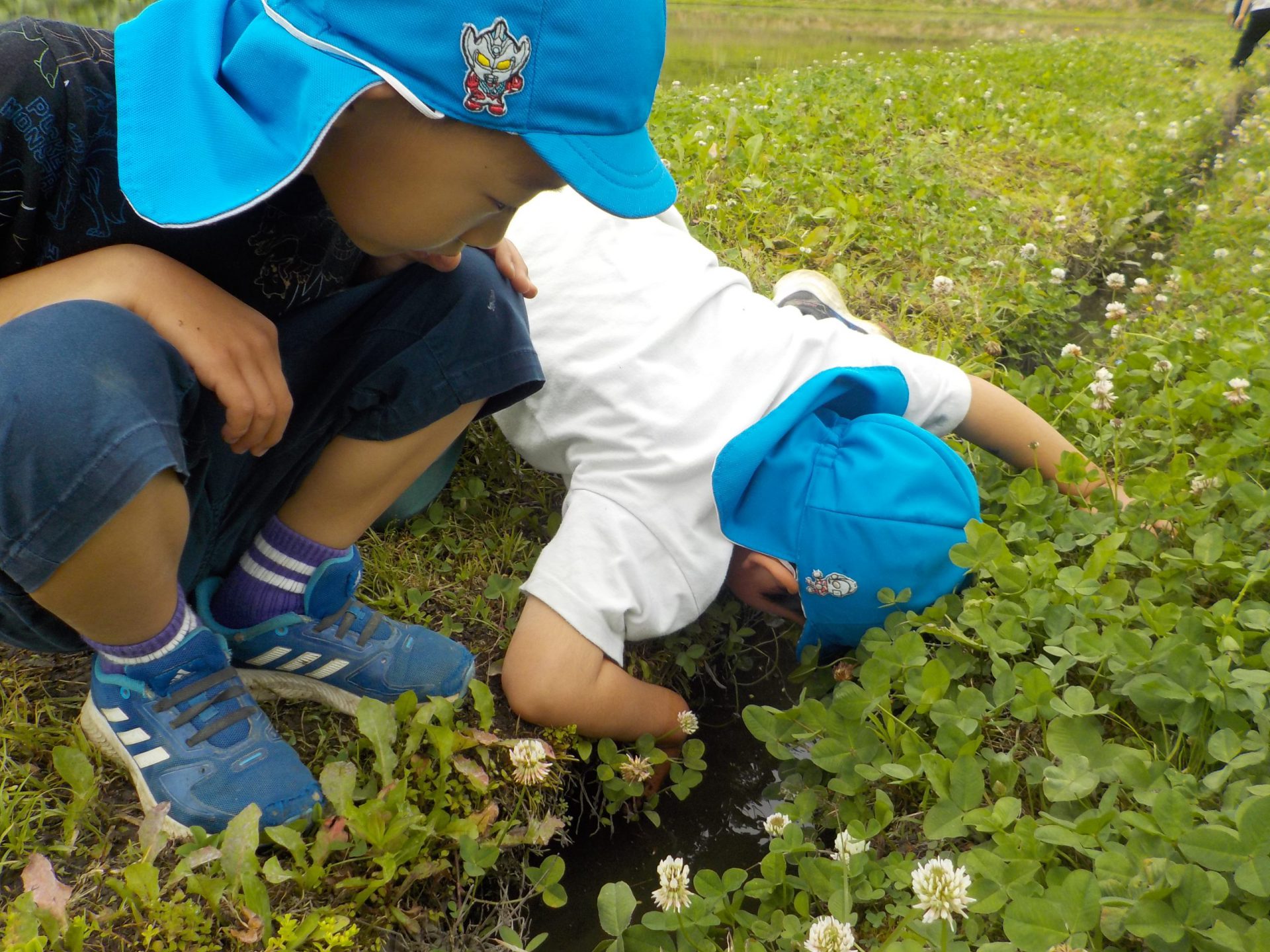 「さあ、ザリガニチームのところまで戻ろうか」となった時、すっと水色帽子の年長さんが遊び疲れた年少さんの手を引いて歩いていました。