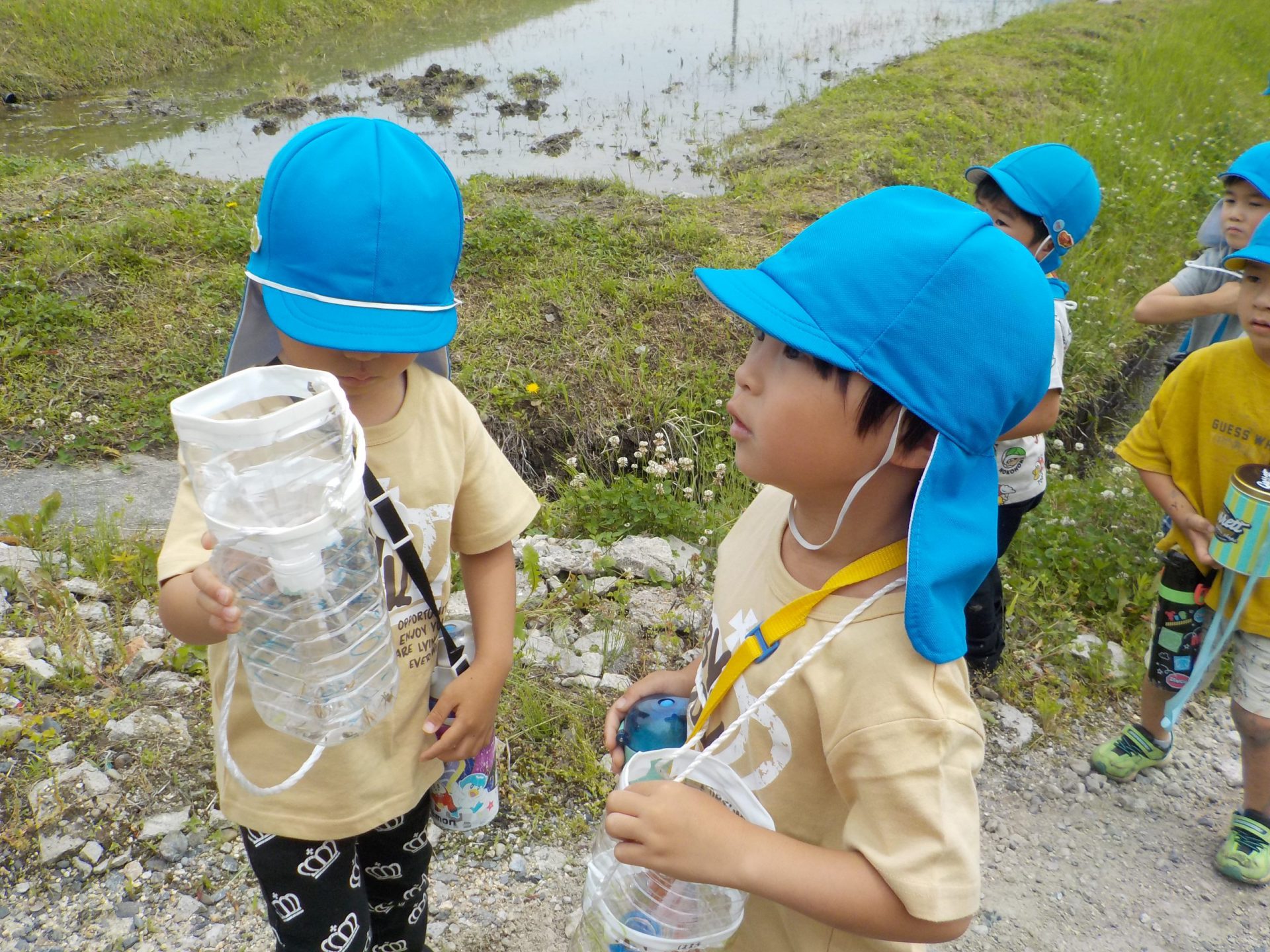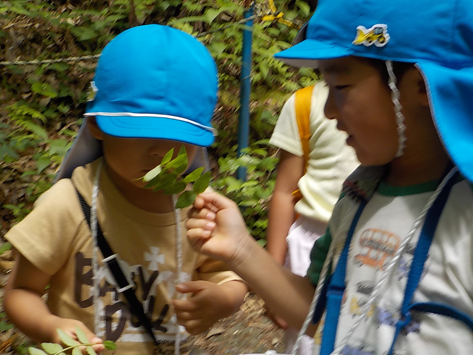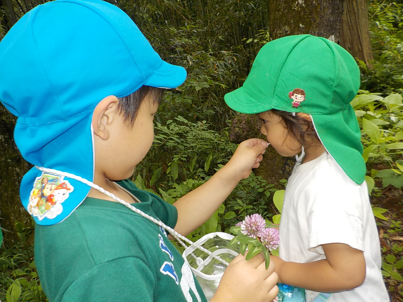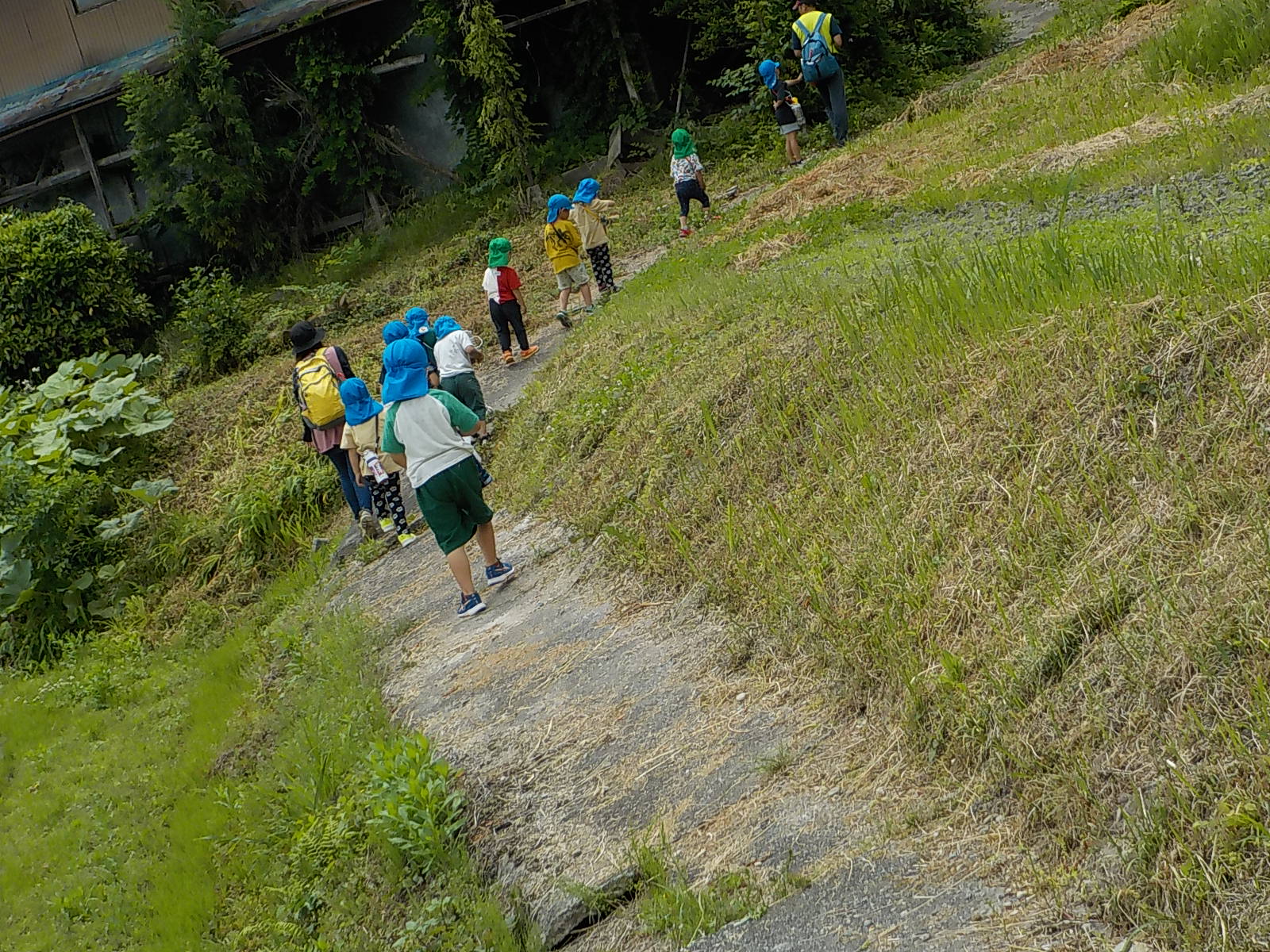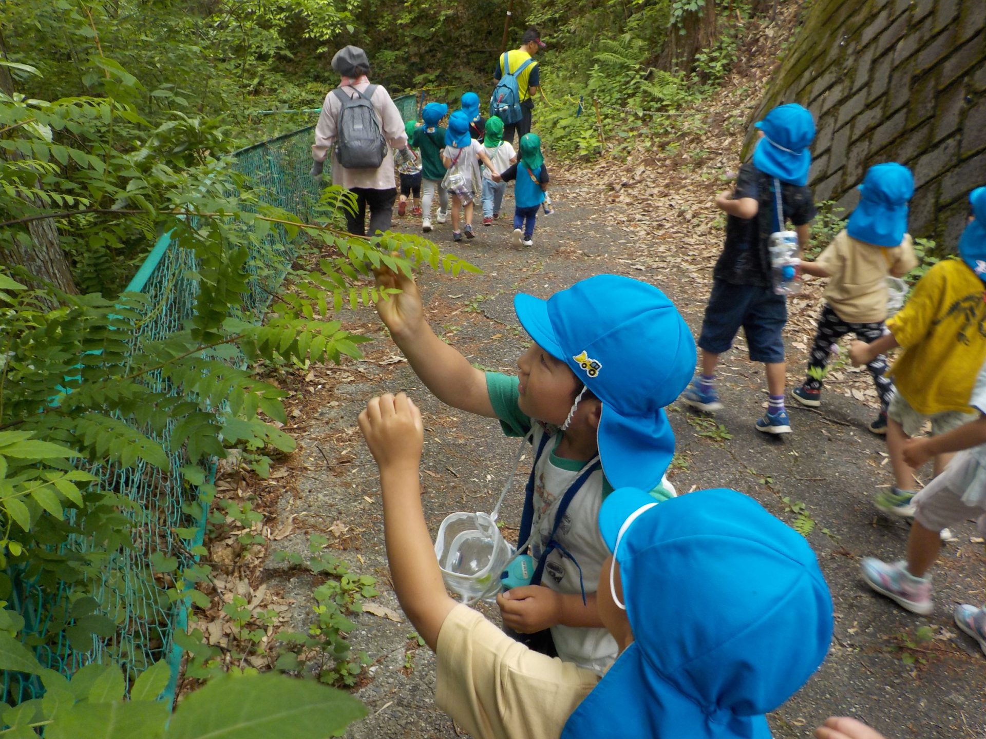 「さあ、ザリガニチームのところまで戻ろうか」となった時、すっと水色帽子の年長さんが遊び疲れた年少さんの手を引いて歩いていました。