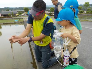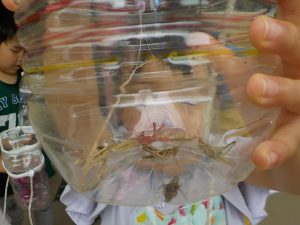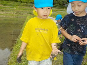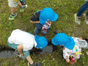 「カエルの卵がたくさんあるに〜」と地域の方が教えてくれたので、田んぼを覗かせてもらい、保育士が卵をすくうと「うわ〜」「トロトロだね」「中に何かいるよ」と卵を観察!