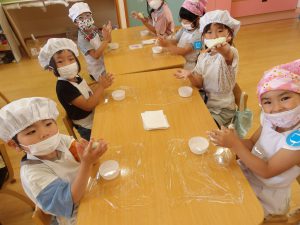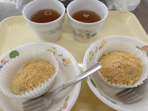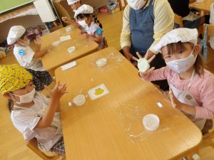 手にくっつく餅に喜んだり、丸めることに苦戦したりしながら、友達と楽しく団子を丸めました。