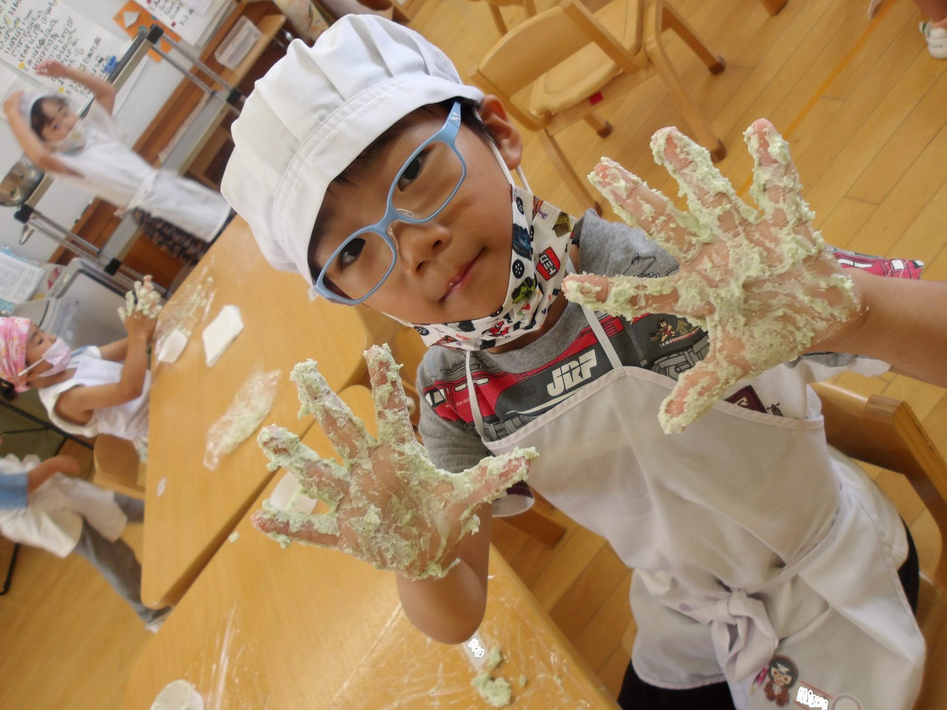 熱が通り縮んだよもぎに驚きながら、部屋に広がるよもぎの香りにニコニコの子どもたち。草団子作りのスタートです。