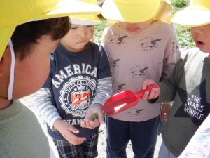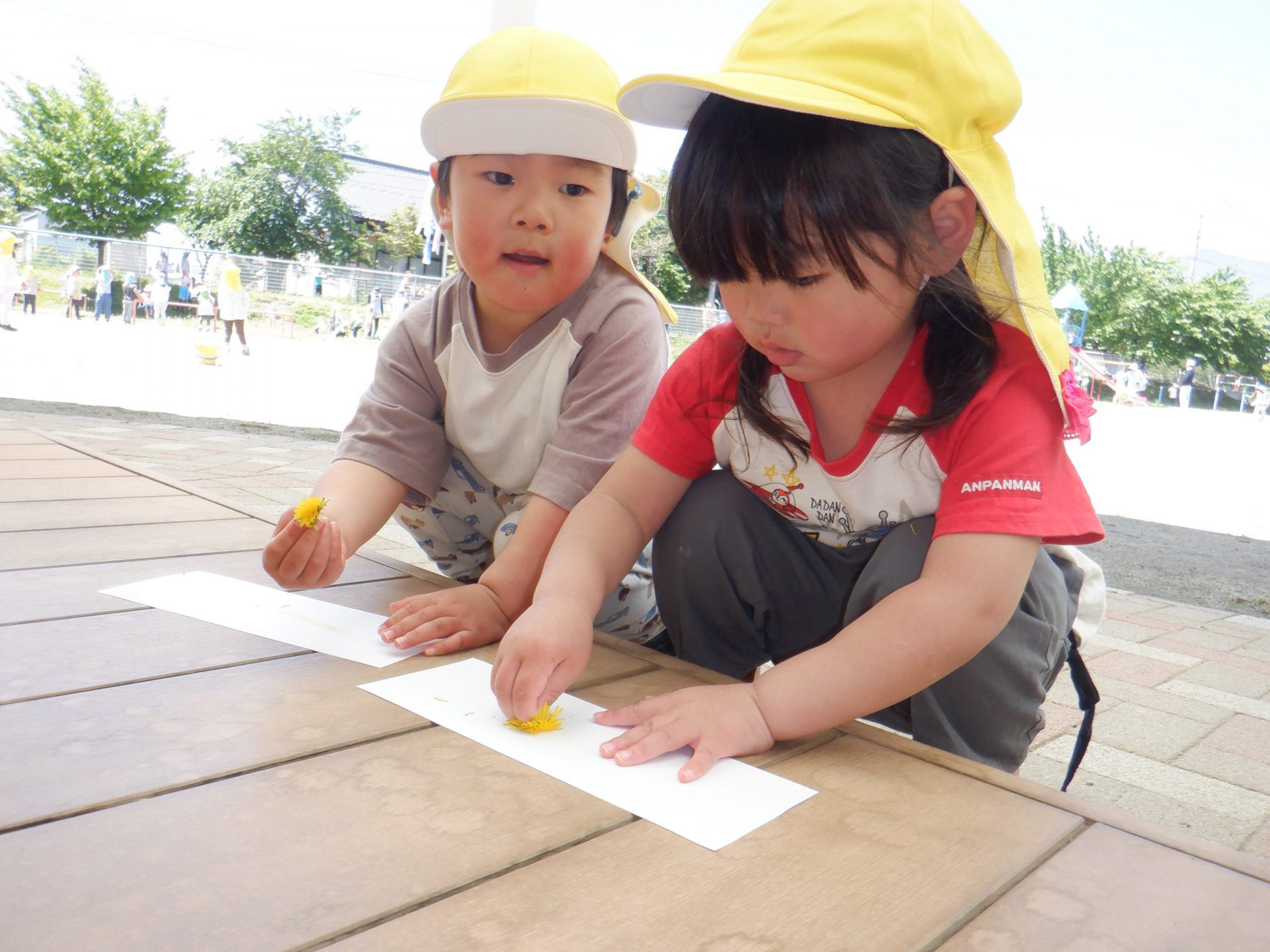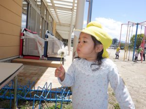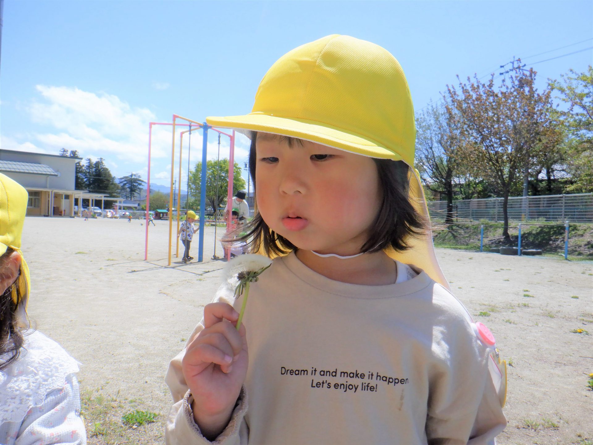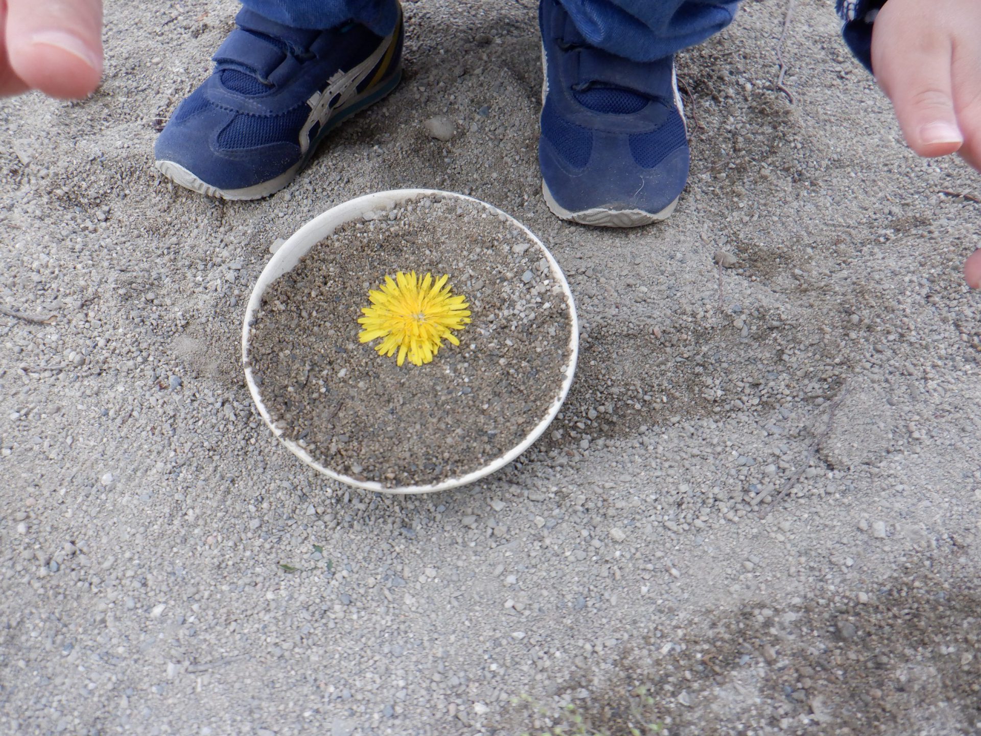 「せんせい!お花あったよ!」園庭に出て遊ぶことが大好きな年少さん。園庭には沢山の春の草花や生き物がいました。