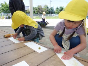 ・葉っぱの形や、握ると色がつくこと、つぶすと色が出ること等、子どもたちは新しい発見をして日々過ごしています。自然物に沢山触れて、五感が豊かに育ってほしいと思います。子ども達の発見やつぶやき、とっても可愛いので、耳を傾けて沢山受け止めていきたいと思っています。