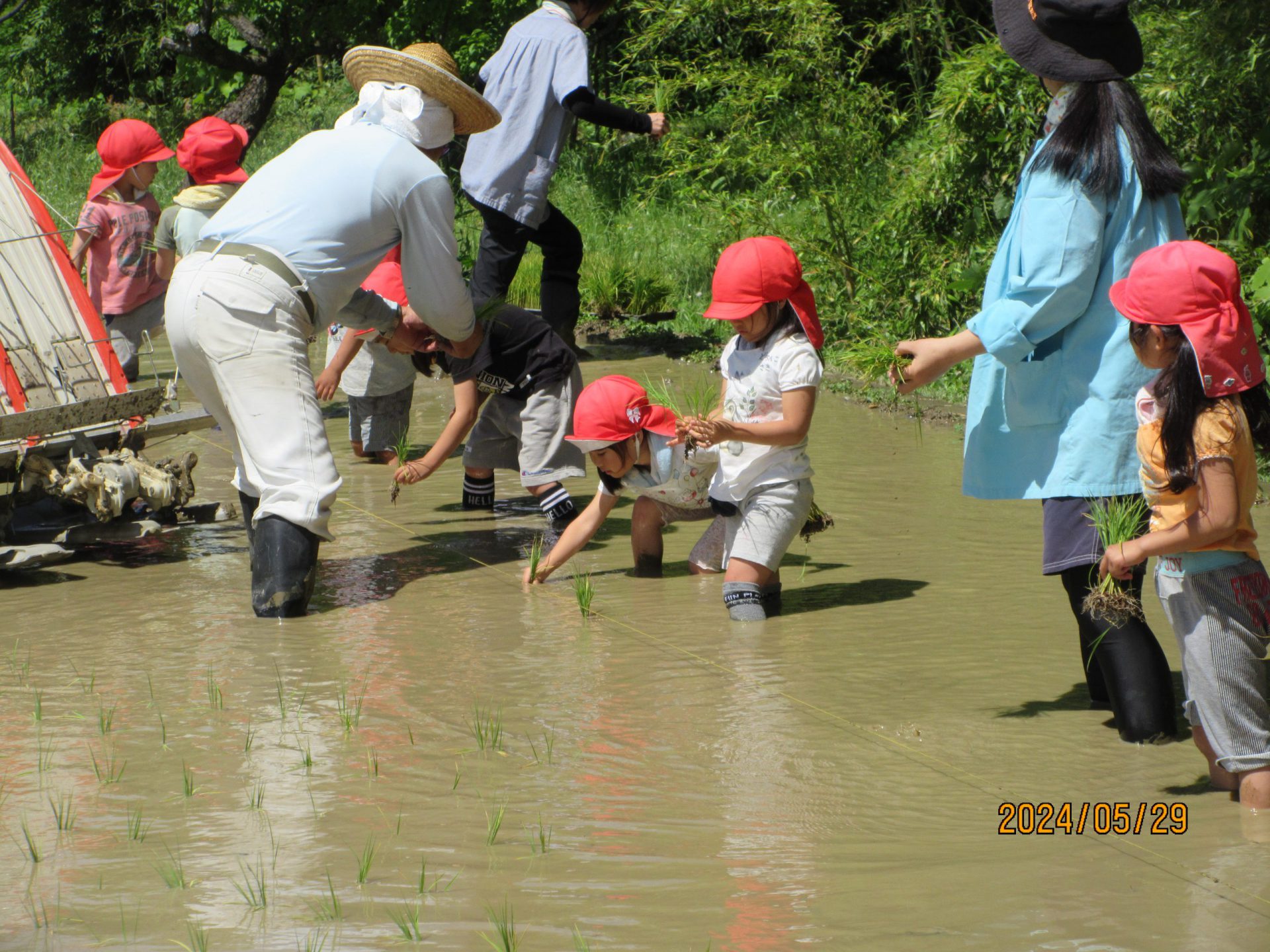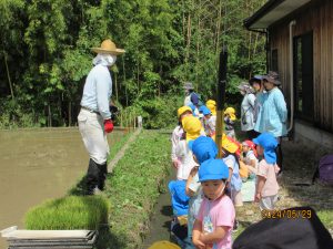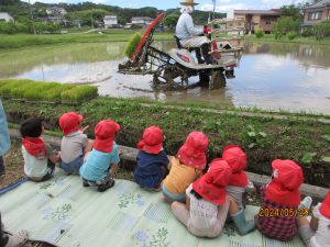 平岩さんのご厚意で年長児が手で植える田植えを経験することができました。また、機械で植える様子も間近に見ることができ、より興味が持てたように思います。