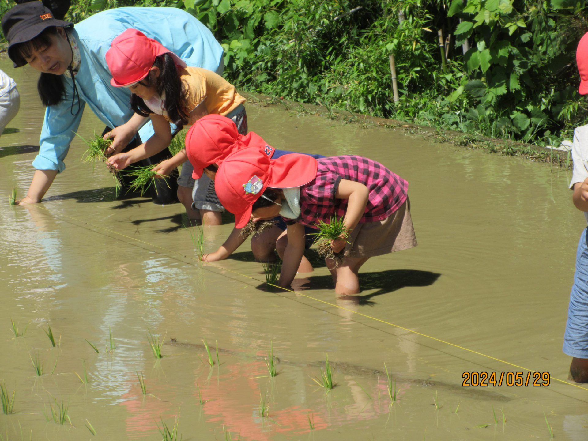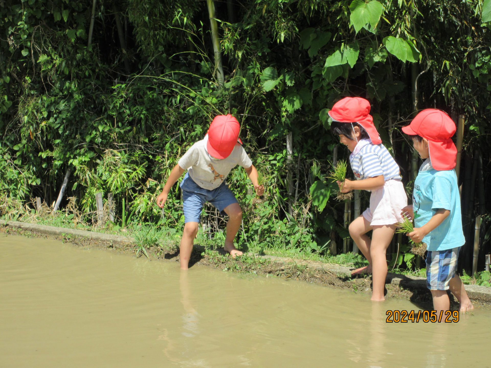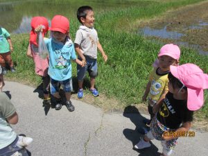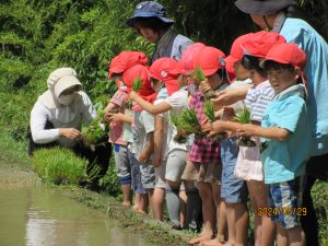 始めは田んぼに入ることにも抵抗があったこども達も、友だちの様子を見たり、職員に促されたりすることで、田んぼに入り、苗を植えていくことで、田んぼの水や土にも慣れ、植えていくことのおもしろさも味わうことができた。