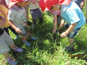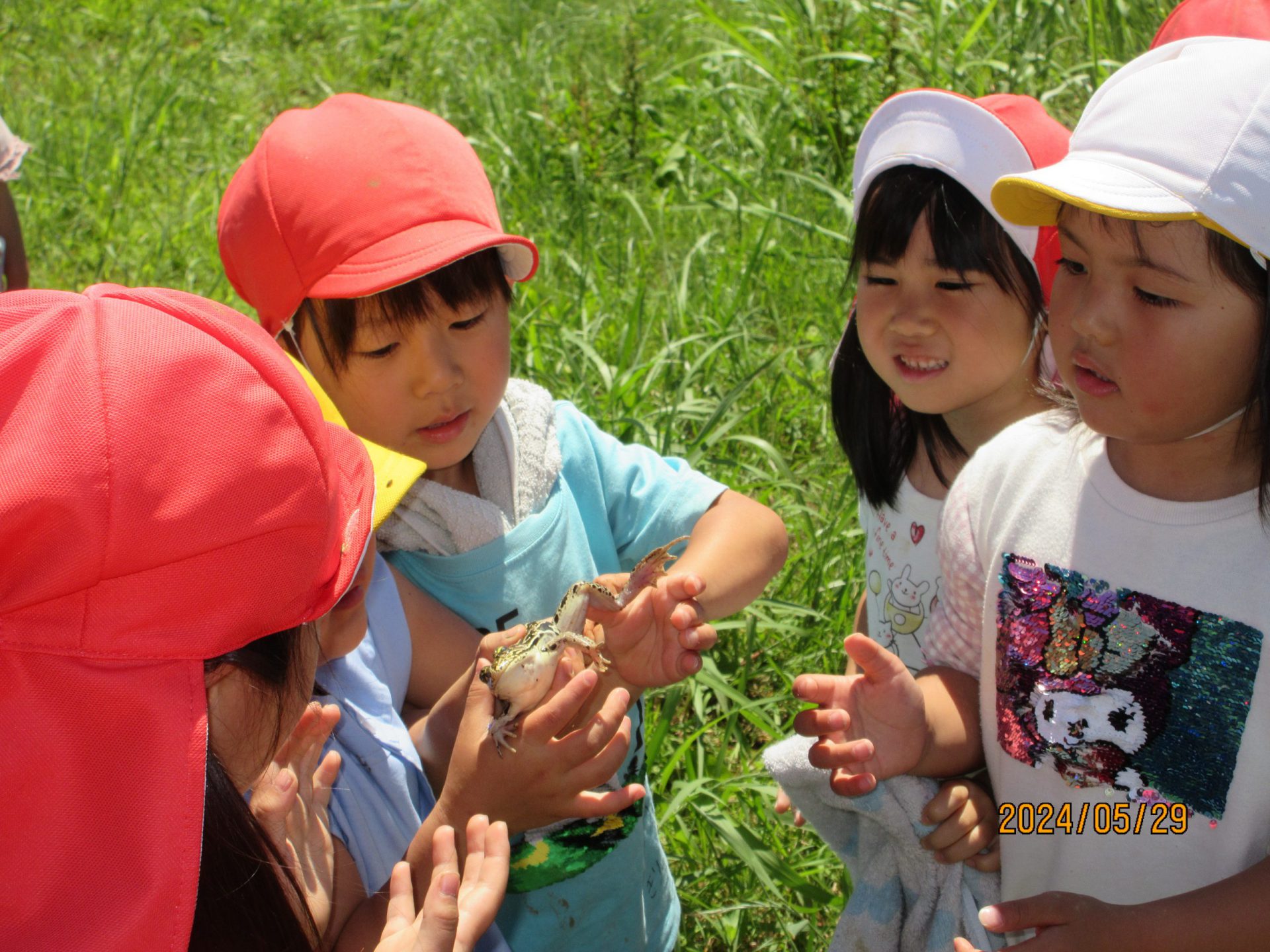 大きなトノサマガエルを発見!年長さんが捕まえると、そこに「見せて〜」と集まるこども達。
